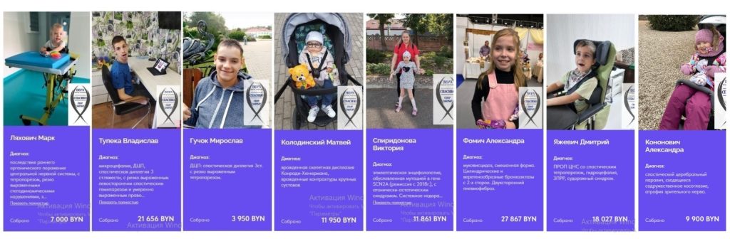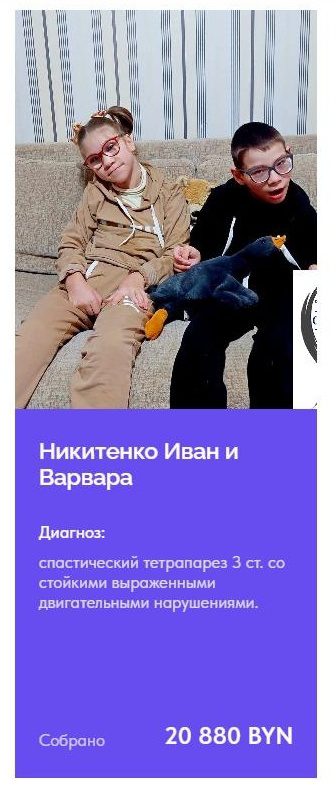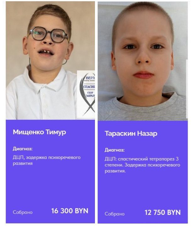Самый маленький из подопечных — пятилетний Артем Пинчук с тяжелой формой ДЦП, эпилепсией и тугоухостью. Он всё понимает, но не говорит. Спастика мешает ему развиваться, а ежедневных занятий массажем и ЛФК недостаточно. Благодаря собранным 23 054 рублям у Артема появился тренажер, который поможет ему делать то, что раньше было недоступно, — больше двигаться. Тренажер уже доставлен в семью, и Артем начинает регулярные занятия. Рядом с Артемом в этом списке — семилетний Артемий Урбанович, которому требовалось полное секвенирование генома. Его мама мечтает понять, как помочь сыну заговорить. Тёма очень общительный, тянется к другим детям, но пока не может сказать ни слова. 3 600 рублей, собранные на анализ, переведены в лабораторию. Результаты помогут врачам подобрать правильную тактику реабилитации, чтобы Тёма наконец сказал свои первые слова.