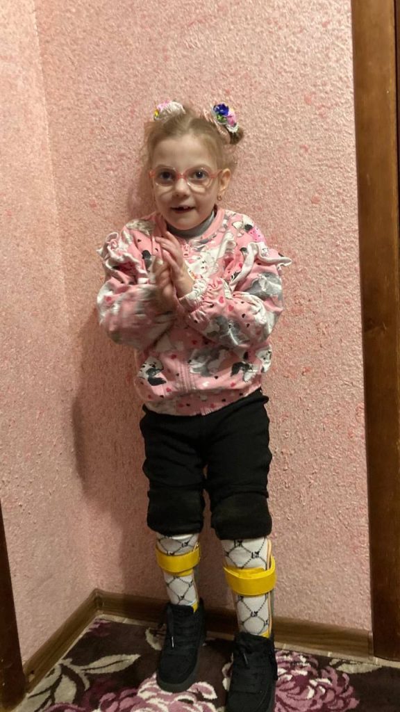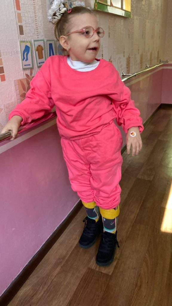 К 6 годам Алёна научилась самостоятельно сидеть, подниматься на четвереньки, ходить с поддержкой. Ребёнку рекомендовано постоянно находиться в специальных ортезах. Это помогает стопе принимать правильное положение, тело с ними становится более устойчивым, что мотивирует Алёну развивать навык ходьбы.