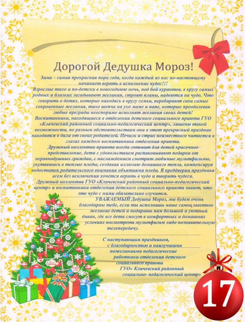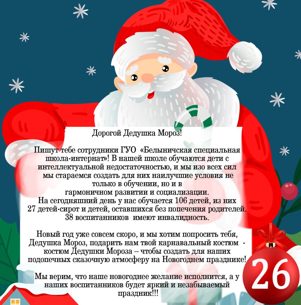 Сделать важные и нужные подарки детям – это просто! Даже небольшое посильное участие каждого из вас поможет значительно улучшить качество жизни детей и подарить им необходимое. Новогодняя почта Деда Мороза получила 4 письма от детских учреждений Могилёвской области.