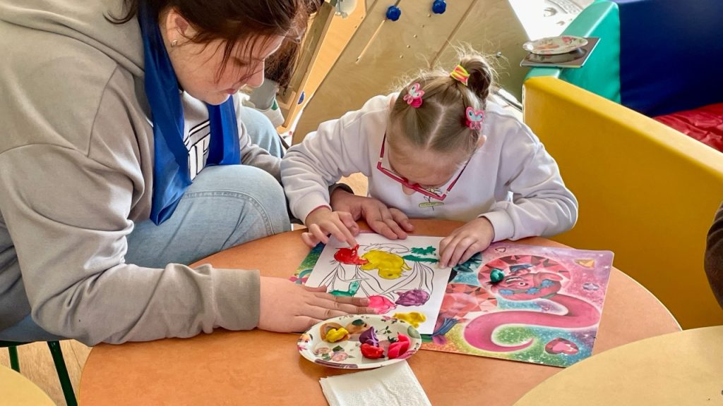 Для детей волонтёры «Веры» провели творческий мастер-класс по лепке из теста-пластилина. Этот материал приятный на ощупь, его можно потрогать и помять. Ребятам предложили разукрасить картинку при помощи теста – отщипнуть небольшой кусочек, затем скатать из него шарик и размазать по поверхности изображения. Увлекательное занятие, которое доставляет не только радость, но и развивает мелкую моторику рук и координацию движений.