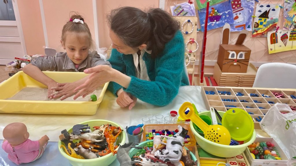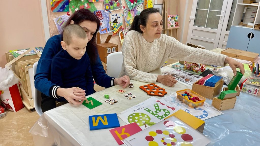 Четверг – день Монтессори-терапии, а тема этой недели – семья. Ребята на примере своей семьи, проговаривали её состав, а имена и фамилии выкладывали при помощи деревянных букв. В зоне математических представлений повторяли цифры и счёт, решали несложные примеры на сложение.