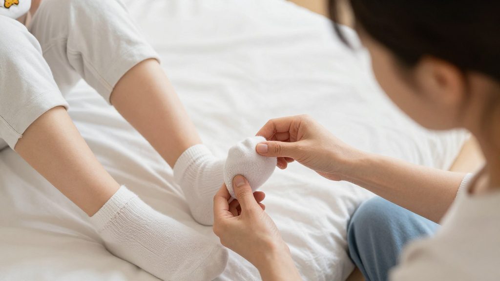 Важно: Всегда проговаривайте действия: «Снимаем носок», «Надеваем носок». Это помогает ребёнку связать визуальный образ с вербальной командой.