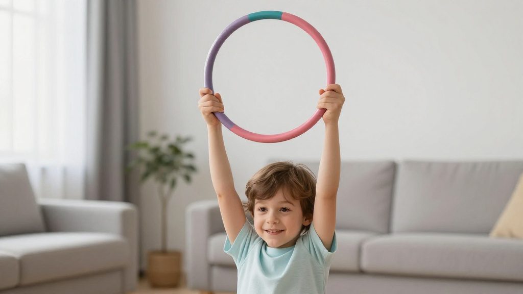 Упражнения с обручем развивают крупную и мелкую моторику, учат ребёнка координировать движения и понимать последовательность действий. Это особенно полезно для детей, которые только учатся одеваться самостоятельно, так как обруч визуально напоминает одежду и помогает малышу легче освоить процесс.