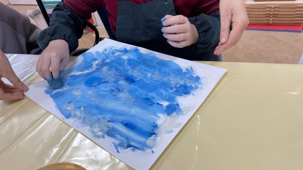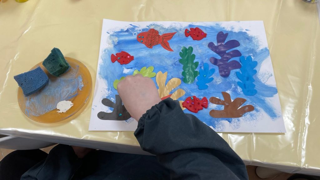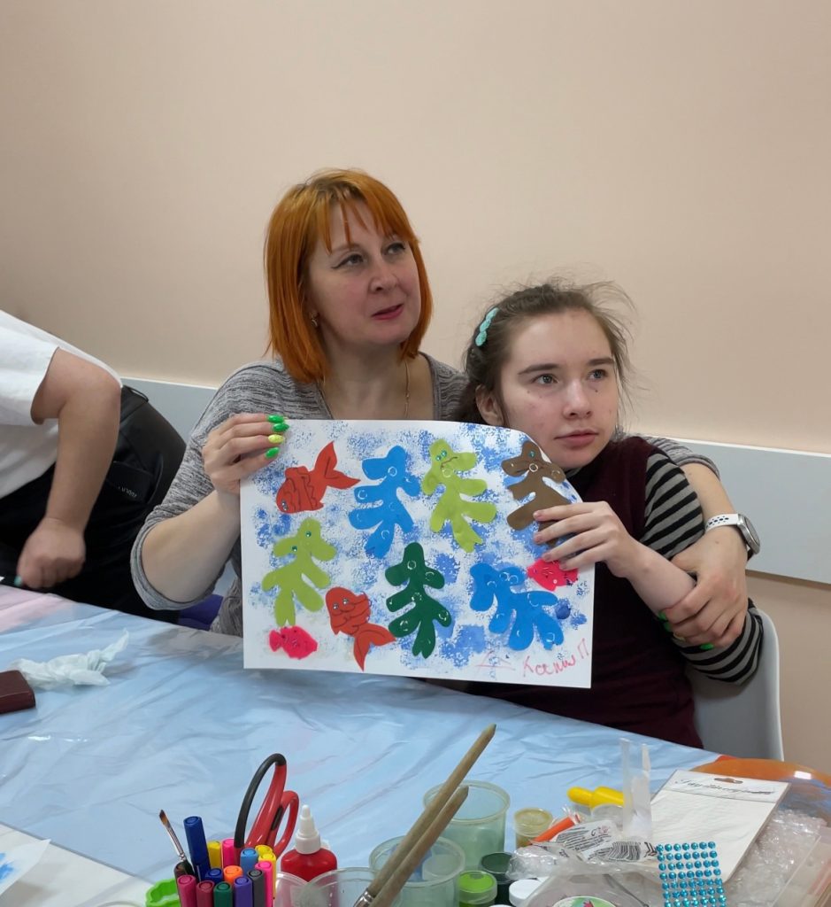 На арт-терапии в пятницу создавали картину «Подводный мир», при помощи губки и спонжиков рисовали фон. Для этого использовали голубую, синюю, белую и фиолетовую краски. Затем из теста-пластилина, используя специальные формочки, вылепливали рыбок. Приклеивали их к фону, а из цветной бумаги вырезали водоросли. Готовую работу украшали бусинами, бисером.