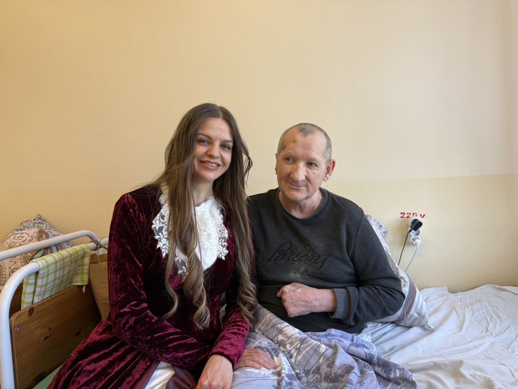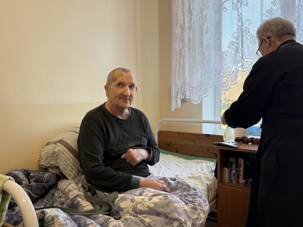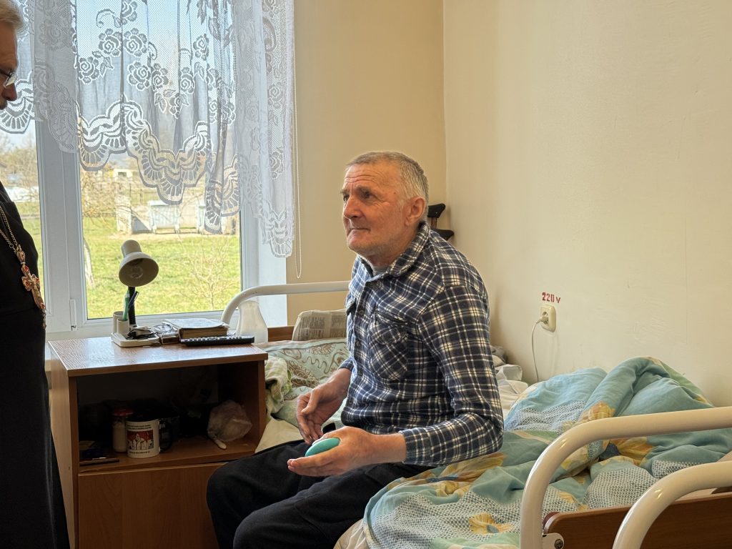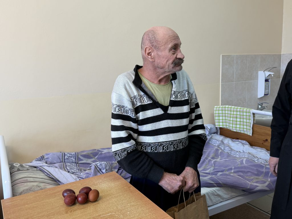 В одной из палат мы встретили Виктора — мужчину с живым, добрым взглядом и тихой, но уверенной улыбкой. Ему шестьдесят два, и он уже не встаёт. С пасхальным яйцом в руках он немного рассказал о своей жизни — о том, что было, и о тех моментах, которые навсегда остались в его памяти…