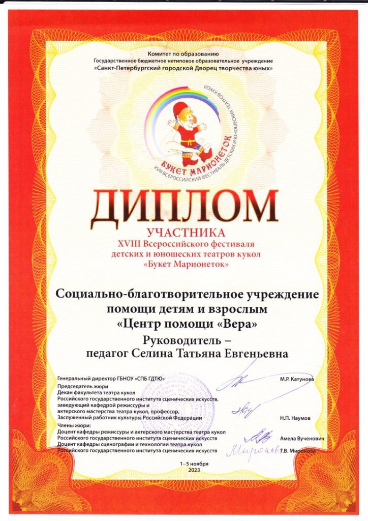 В ноябре 2023 года детский театральный коллектив «Веры» принял участие в ХVIII Всероссийском фестивале детских и юношеских театров кукол «Букет марионеток», где постановка ребят «В сказочном морковном лесу» была удостоена специального приза жюри «За интересный и творческий поиск в художественном воспитании детей».