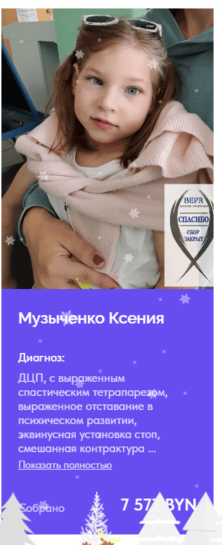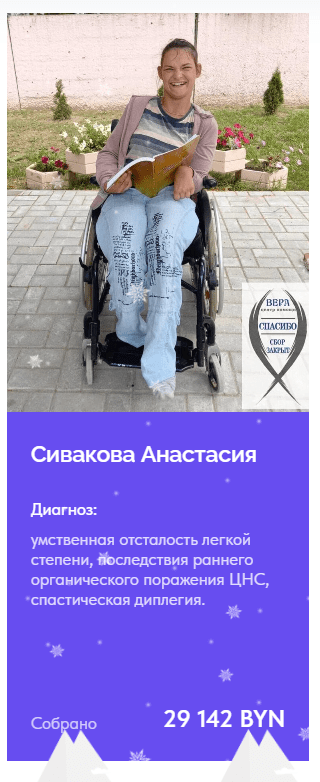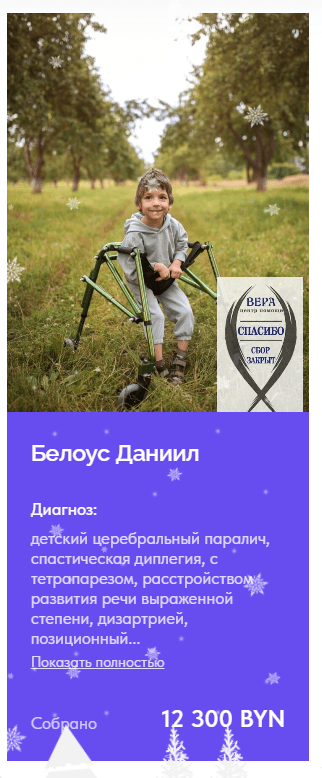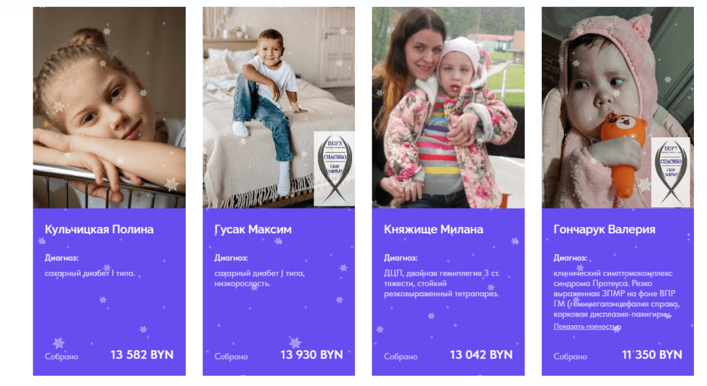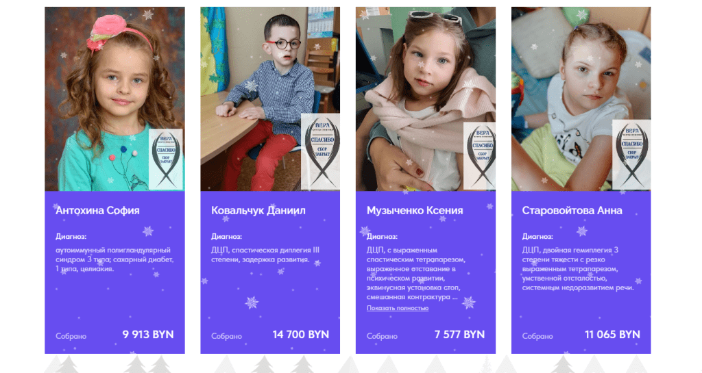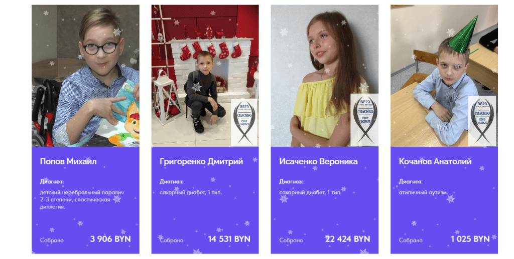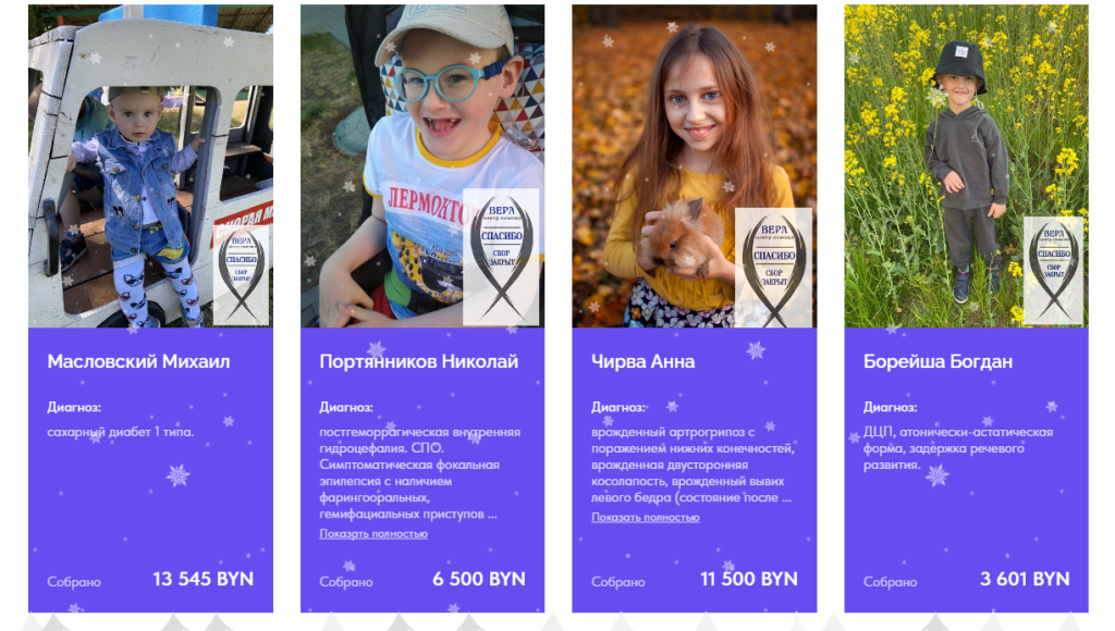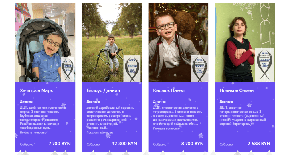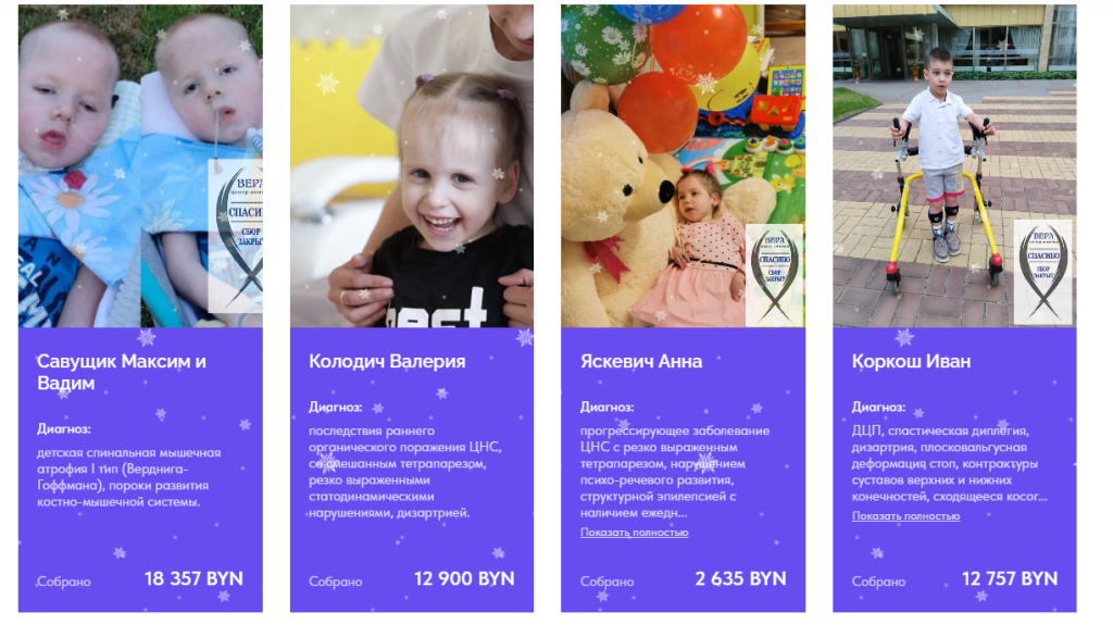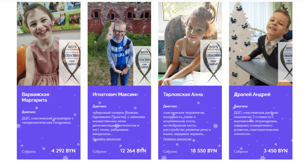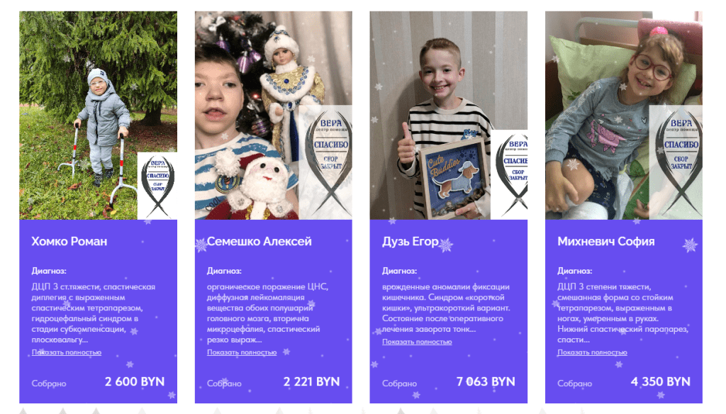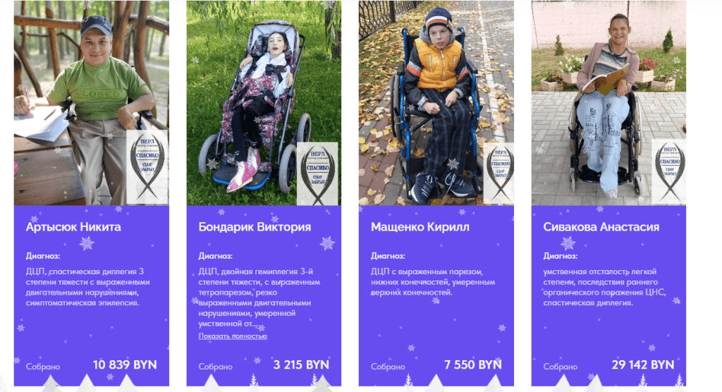 Центр помощи «Вера» вёл сбор средств на приобретение многофункциональных кресел Baffin Automatic LIW (с доп. комплектующими) для Ковальчук Даниила из Бреста и Тарловской Анны из Минска, детского реабилитационного кресла для Хачатрян Марка из Бреста. Помощь была оказана Гончарук Валерии из Брестской области на приобретение реабилитационного стульчика для детей-инвалидов с доп.комплектующими.