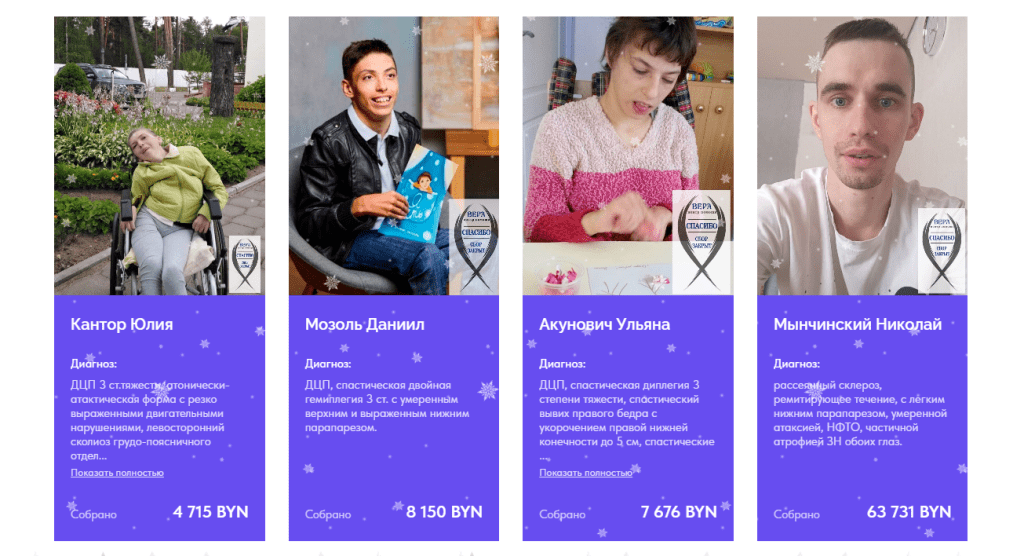 Средства на приобретение специализированных инвалидных колясок были собраны для тяжелобольных детей и взрослых – Михаила Попова из Лиды, Княжище Миланы из Витебска, Кислюка Павла, Старовойтовой Анны, Коркош Ивана, Бондарик Виктории из Минска, Варванской Маргариты, Драпей Андрея из Гомельской области, Михневич Софии из Гродненской области, Портянникова Николая из Гродно, Яскевич Анны, Мащенко Кирилла из Витебской области, Мозоль Даниила, Артысюк Никиты из Бреста.