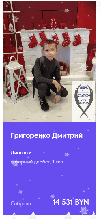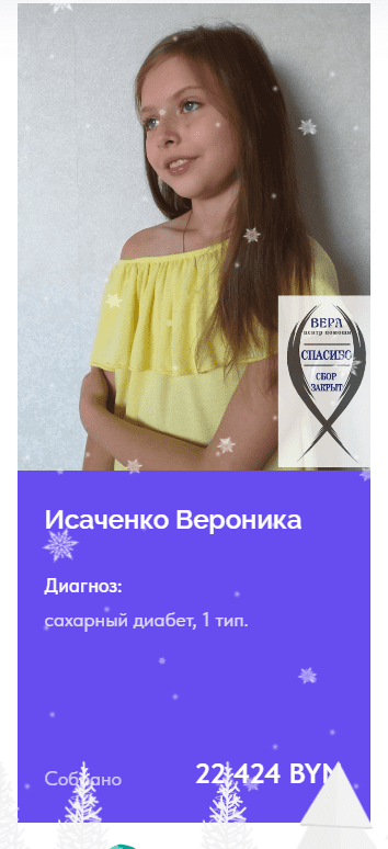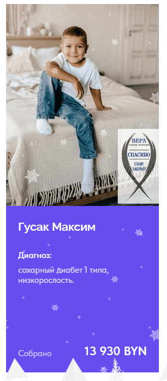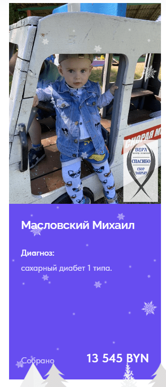 В разном возрасте детям был поставлен неизлечимый диагноз – сахарный диабет первого типа. Страдают такие детки от ежедневных многочисленных уколов пальцев для контроля сахара в крови, от инъекций инсулина. Это ухудшает качество их жизни, доставляет боль и дискомфорт. Родители детей с сахарным диабетом обращались в Центр за помощью в сборе средств на приобретение специальных диагаджетов – инсулиновых помп, сенсоров, устройств для инфузий, резервуаров для инсулиновых помп. Эти устройства избавляют от необходимости делать многочисленные уколы, повышают качество жизни детей с сахарным диабетом.