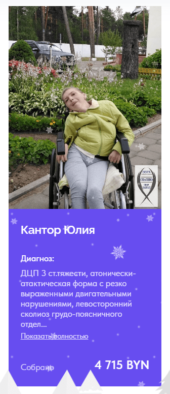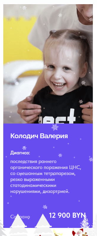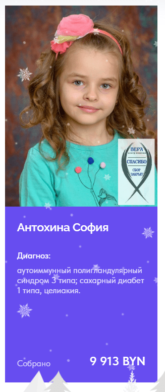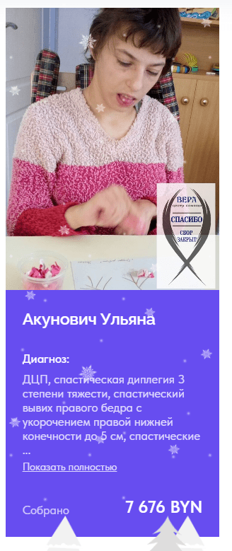 Для Мынчинского Николая из Витебской области Центру удалось собрать внушительную сумму – 63 731 рубль на оплату лечения рассеянного склероза с последующей аутологичной трансплантацией костного мозга, для Пухальской Елизаветы на оплату операции по реконструкции левой ушной раковины.