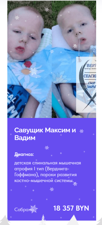 Тяжелобольным двойняшкам Максиму и Вадиму Савущик из Гомельской области с диагнозом спинальной мышечной атрофией первого типа Центр помог собрать средства на приобретение жизненно необходимого ребятам устройства – медицинского аспиратора.