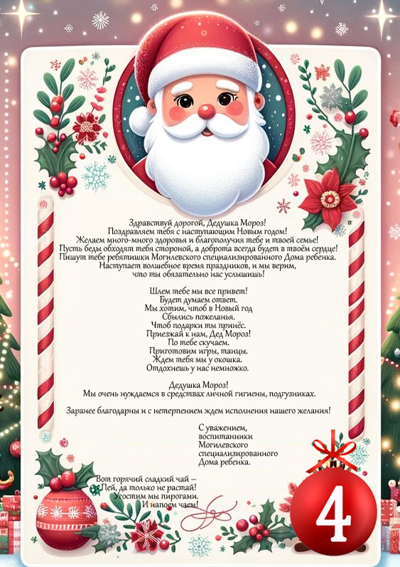 Вы перешли на письмо, а значит, вы уже решили помочь детям! Что делать дальше? Ниже размещено письмо. Нажмите на него и прочитайте, с какой просьбой дети обращаются к Деду Морозу. Ниже прикреплены реквизиты, на которые вы можете сделать посильное пожертвование. Сумма пожертвования может быть любой. В назначении платежа обязательно укажите номер шара, которому присвоено письмо учреждения. Например, «шар № 5». По мере поступления средств шарики будут заполняться цветом. Наша цель, что бы абсолютно все шарики закрасились на 100%! Если вы представляете юридическое лицо и желаете принять участие в акции, свяжитесь с нашим специалистом для заключения договора о безвозмездной спонсорской помощи. Телефон для связи со специалистом Центра +375 33 6466274. Подробнее об акции читай здесь - Жми на шарики! Исполняй мечты детей-сирот! Дан старт новогодней акции «Вера в чудо!»