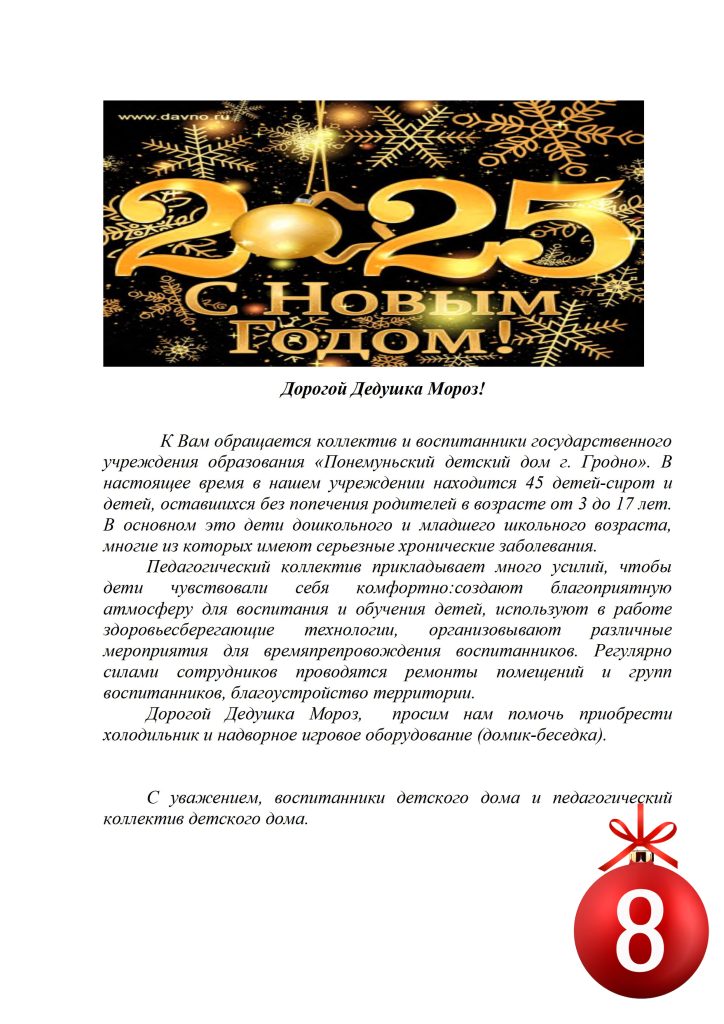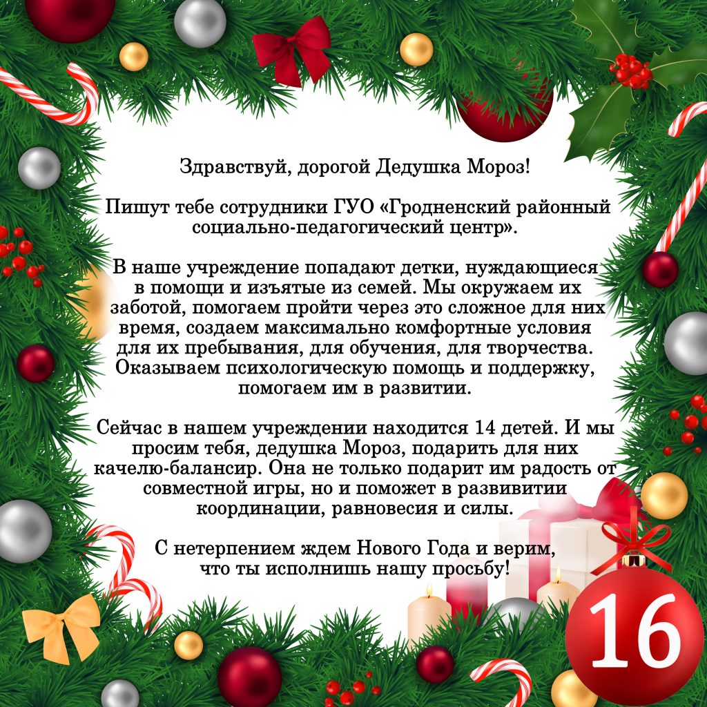 Гродненский районный социально-педагогический центр обратился к Деду Морозу «Веры» с просьбой подарить для деток из приюта качели-балансир (шар №16). На подарок необходимо 1000 рублей.