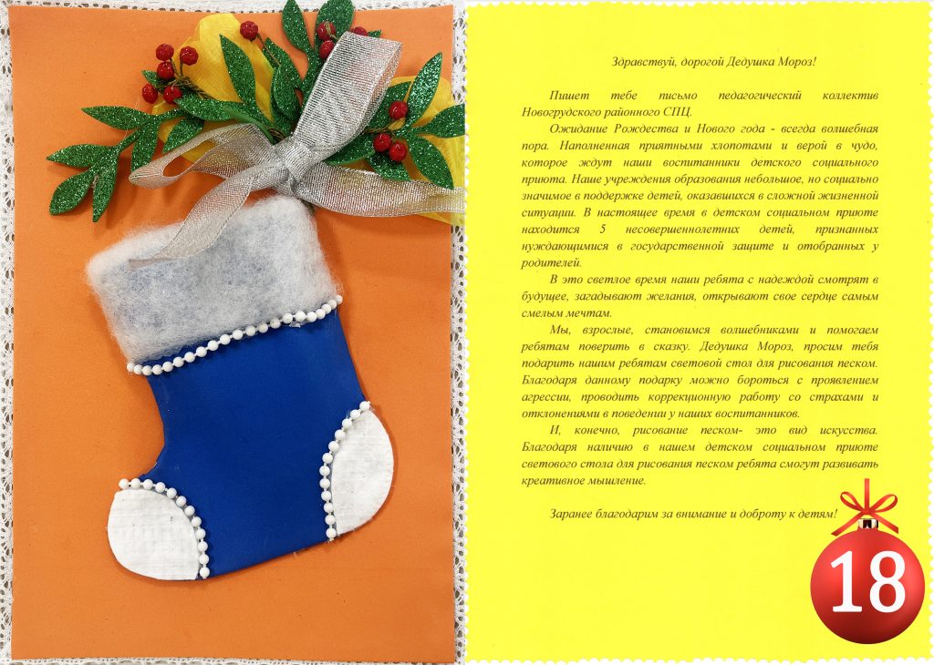 Новогрудский районный социально-педагогический центр загадал у Деда Мороза световой стол для рисования песком. Такое оборудование необходимо ребятам для интересного досуга, расслабления, творчества (шар №18). Необходимая сумма для подарка – 1000 рублей.