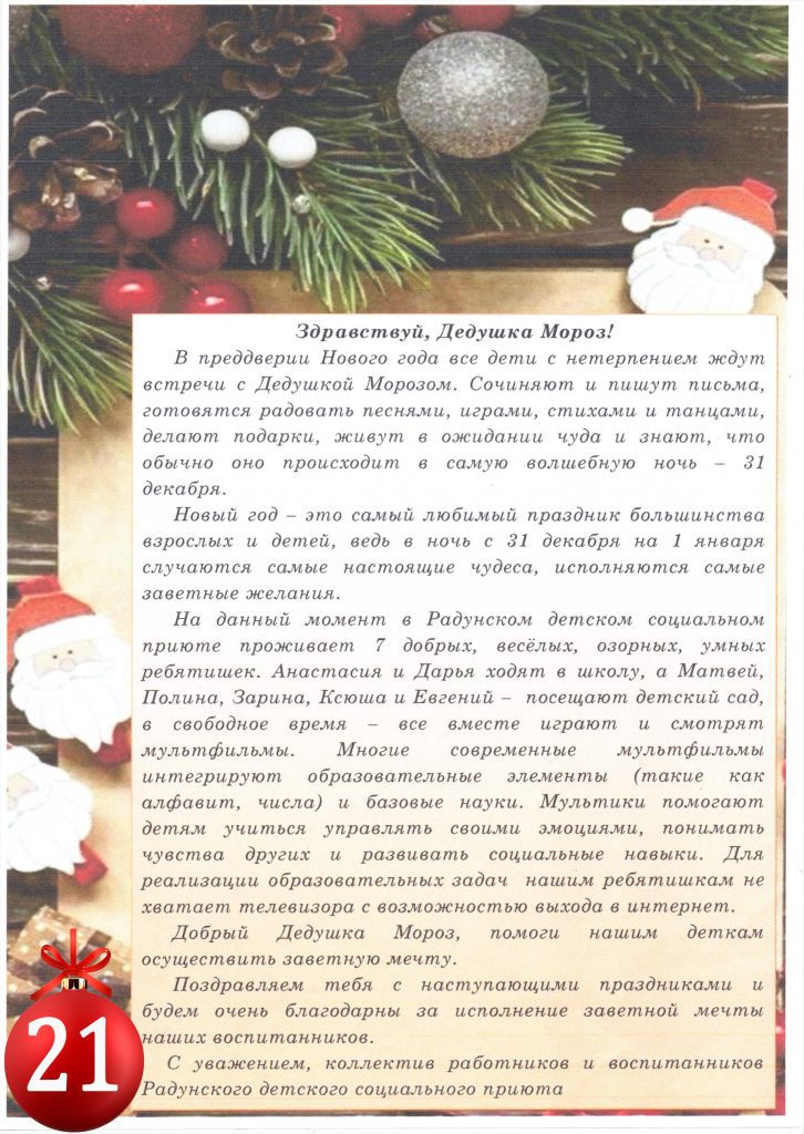 Радунский государственный социально-педагогический центр Вороновского района просит о практичном подарке для детей – телевизор с возможностью выхода в интернет (шар №21). Необходимая сумма – 1000 рублей. На этот шарик поступило только 19 рублей 82 копейки.