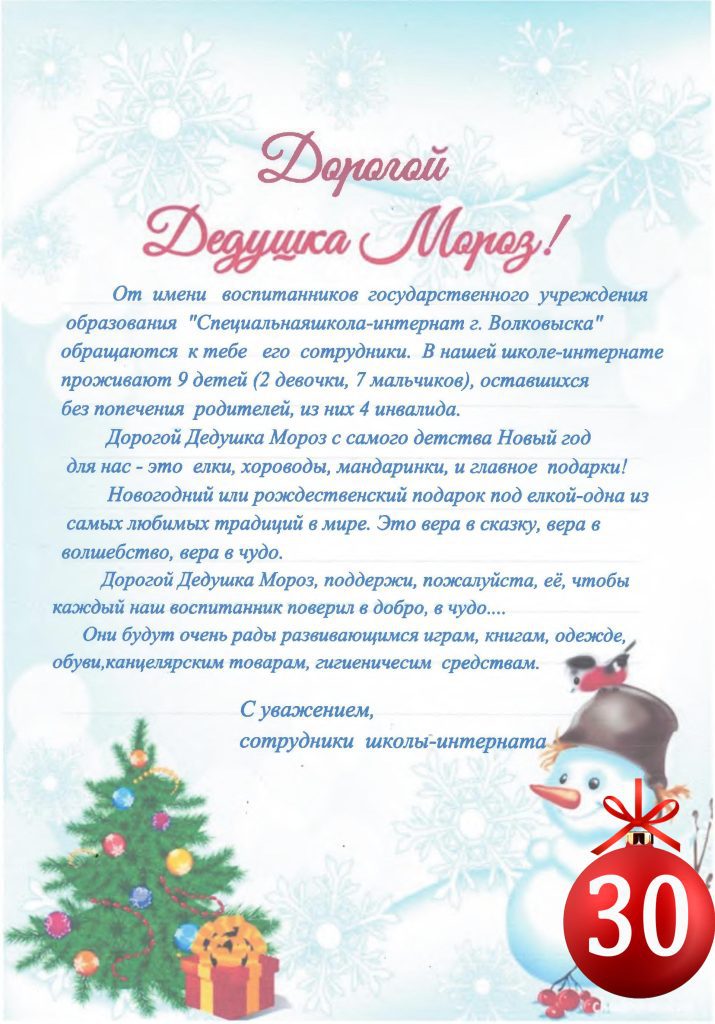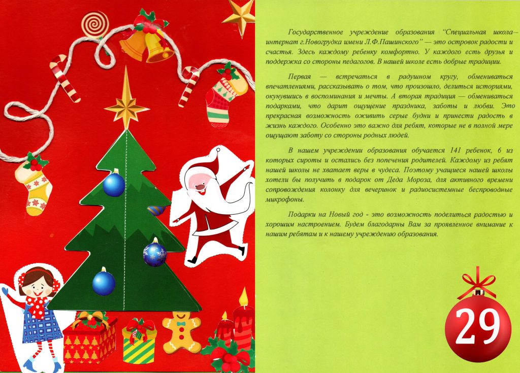 Новогодняя почта получила ещё два письма от Специальной школы-интерната г.Новогрудка имени Л.Ф.Пашинского (шар №29) и Специальной школы-интерната г.Волковыска (шар №30).