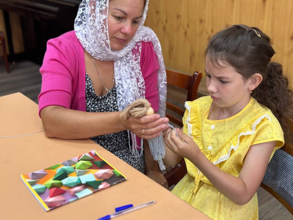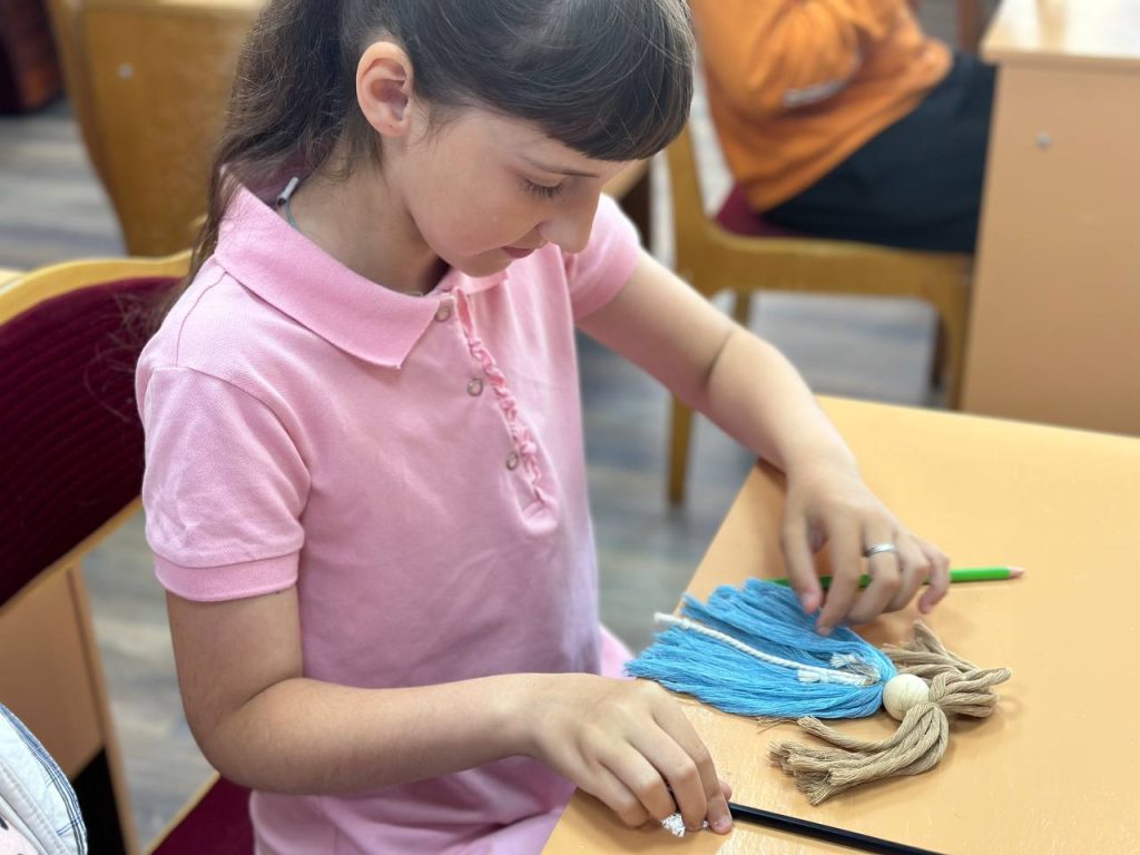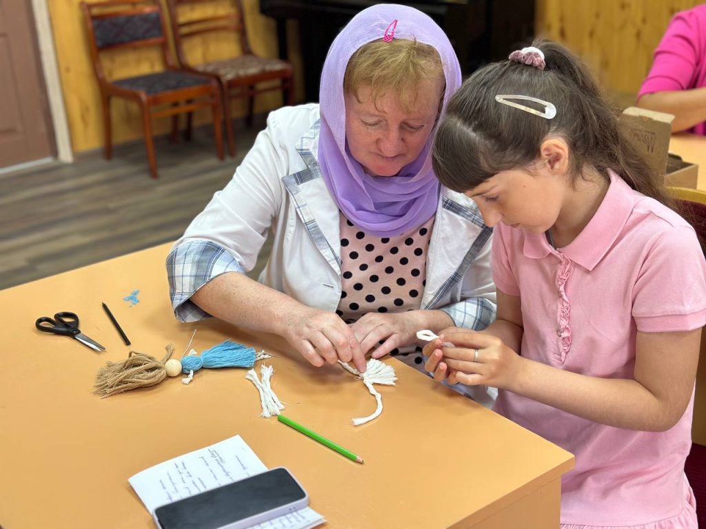 Второй день лагеря запомнился ребятам необычной творческой встречей в монастыре, где дети делали личного ангела-хранителя. Ребята сначала рассуждали на тему, кто такой ангел-хранитель и какое значение имеет в жизни человека. А затем в технике макраме делали куколок-ангелов. Важно было придумать и место, где будет жить ангелок – на улице дети цветными мелками рисовали радугу и облака. А в завершении ребята решили порадовать ангела маленьким добрым делом – собирали шишки, показывая, что даже небольшим действием и малым усилием человек может творить добро.