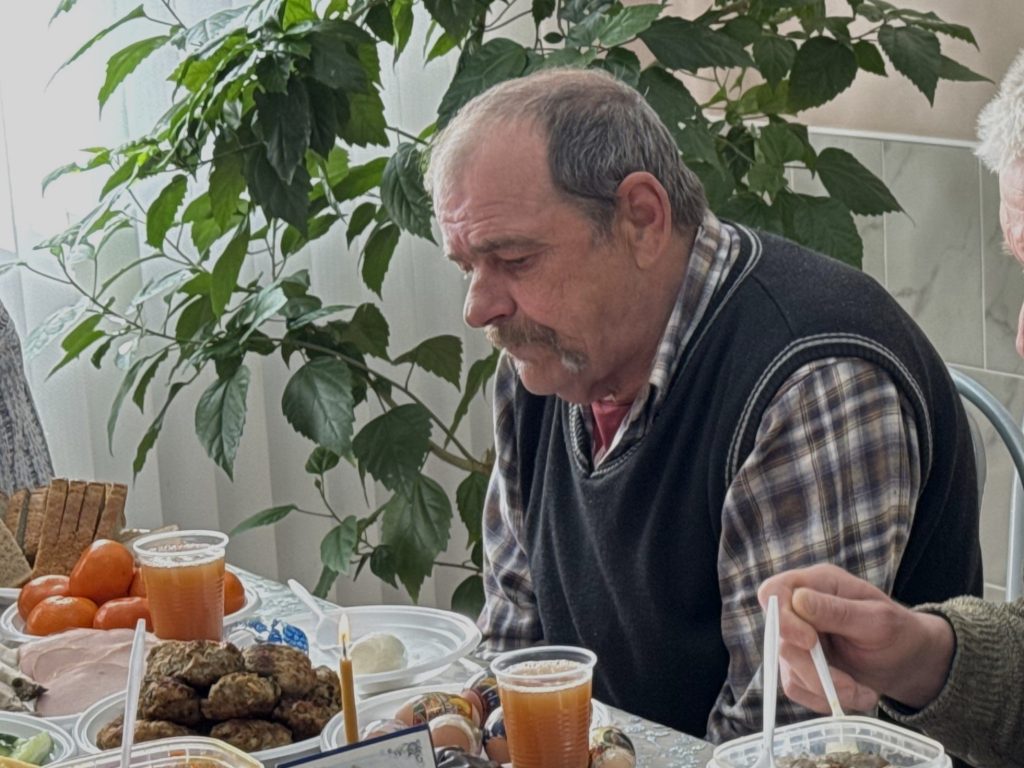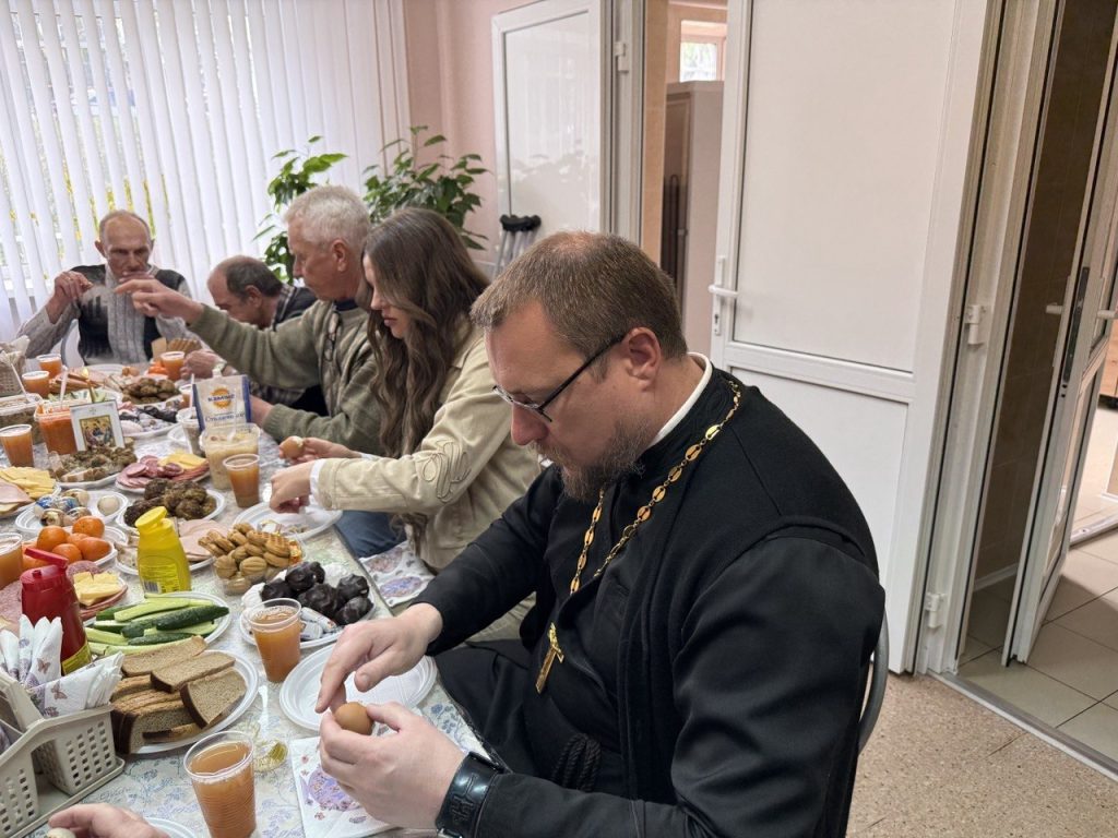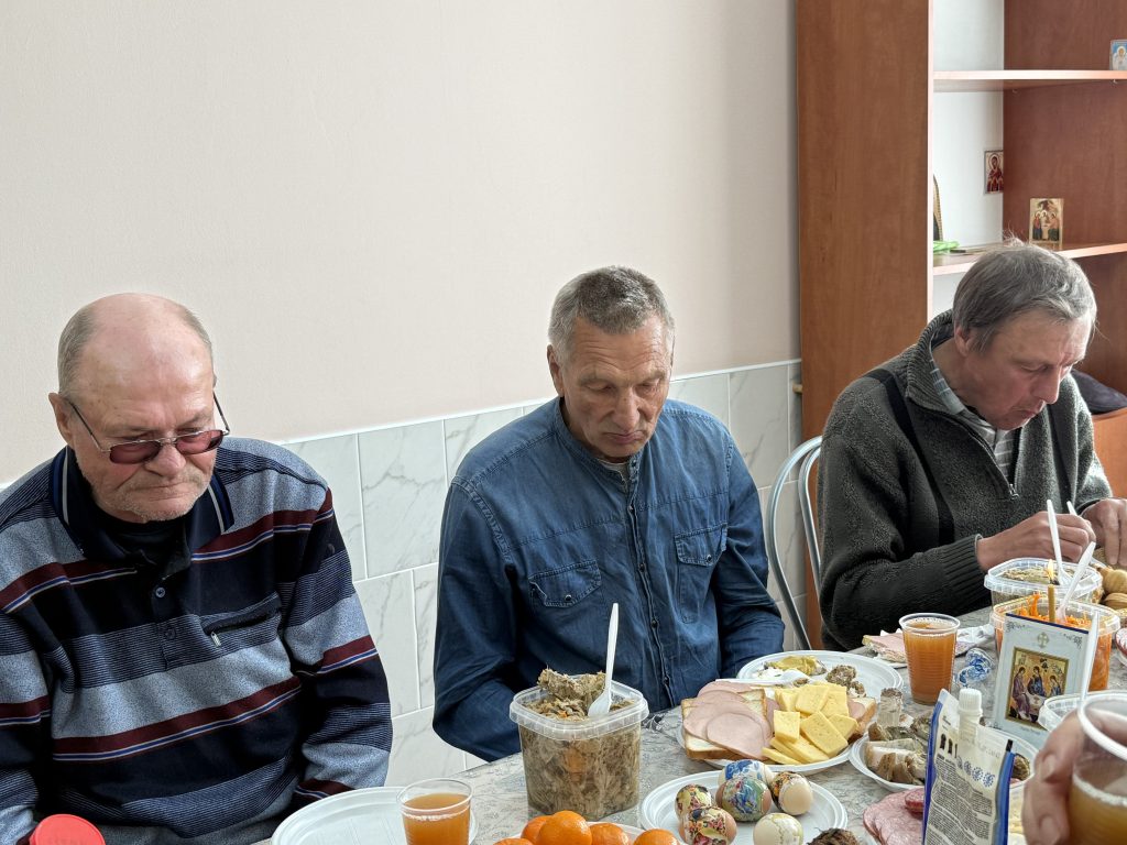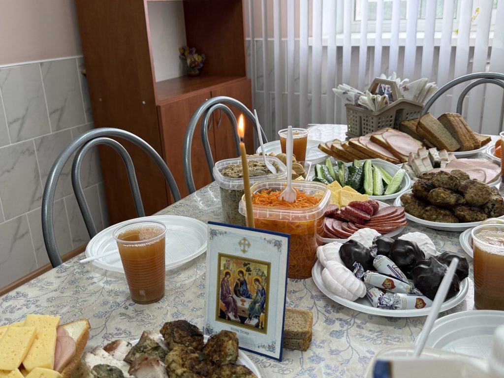Пасха длится сорок дней, но для постояльцев этот праздник — не просто традиция, а редкий момент тепла и общности. В комнате приёма пищи в этот день с самого утра тихо звучали слова молитвы. Голос отца Александра спокойно и твёрдо выводил каждое слово: