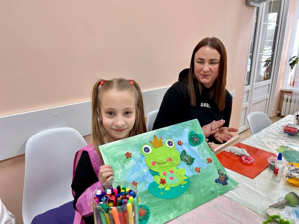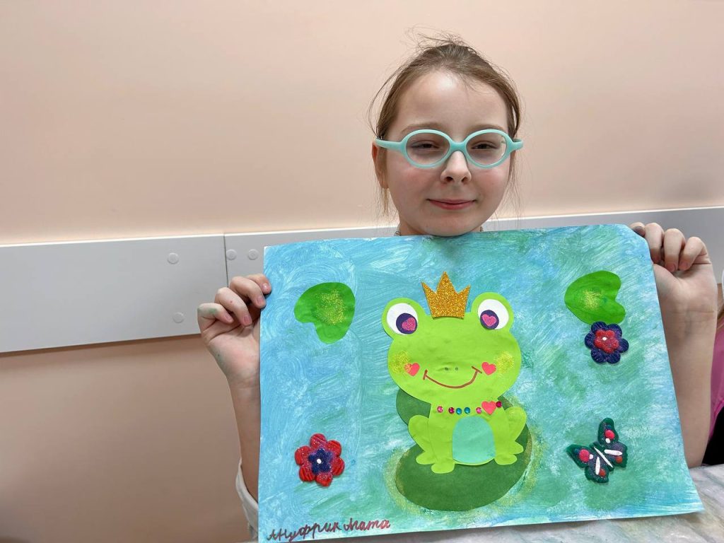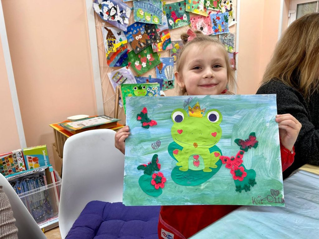Арт встречи у ребят сейчас посвящены воспоминаниям о самых любимых сказках. На этот раз вспоминали русскую народную сказку «Царевна-лягушка». Смешивая разные оттенки зелёного, с помощью гуаши дети создавали пруд, в технике аппликации – мастерили царевну-лягушку, а украшали работу фигурками из тесто-пластилина и мелких клеящихся украшений. В процессе работы ребята вспоминают сюжет сказки, слушают мелодии и песенки к ней, фантазируют, как бы могли выглядеть на бумаге те или иные герои.