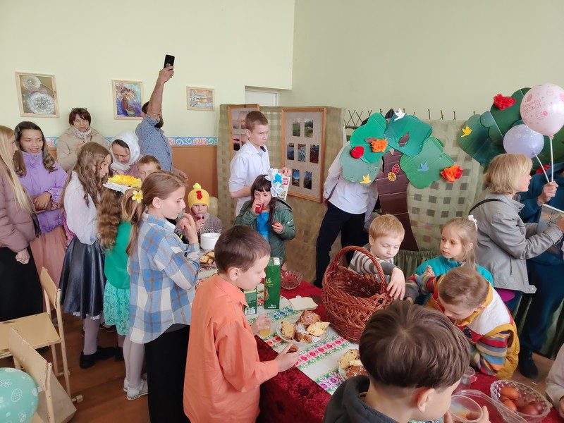 Прежде чем перейти к долгожданному чаепитию с куличами и сладостями, состоялся трогательный момент поздравлений. На праздник была приглашена директор Центра помощи «Вера» Антонина Мисюкевич. Поприветствовав всех с наступившей Пасхой, Антонина вместе с братией монастыря вручила каждому воспитаннику воскресной школы пасхальные подарки.