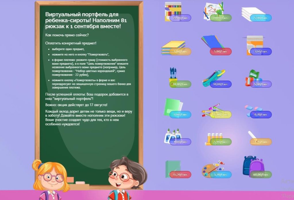 — после оплаты ваш подарок мгновенно «отправится» в виртуальный рюкзак! На интерактивном поле вы сможете видеть, как наполняется «виртуальный портфель» благодаря таким же отзывчивым людям, как вы!