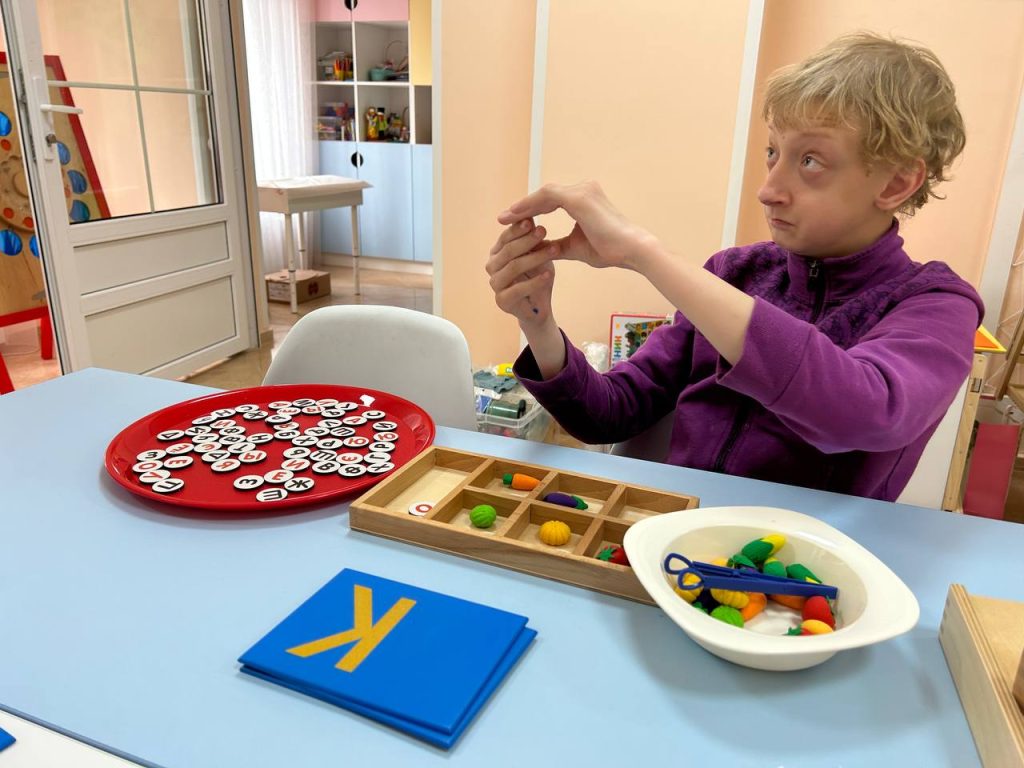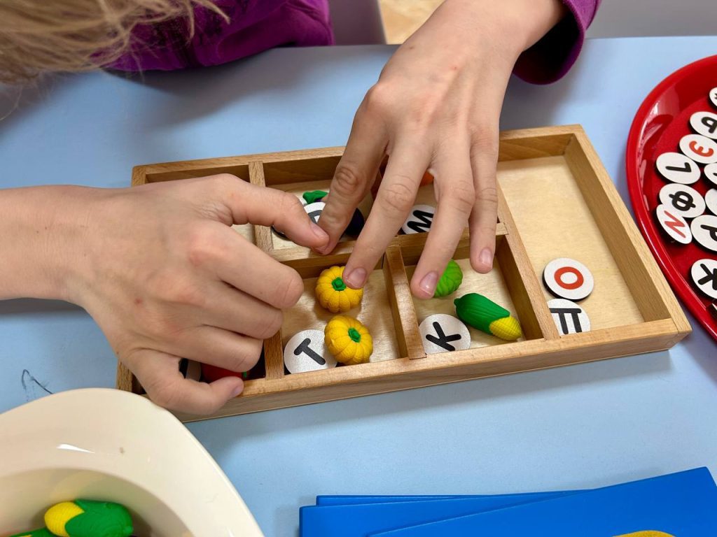 В зоне развития речи на Монтессори-терапии ребята работали с буквой Щ. Вырезали и клеили картинки, начинающиеся на эту букву, работали с шершавыми дощечками, с помощью которых ребята запоминают образ буквы, готовят руку к её написанию. В зоне практической деятельности ребята работали со щипцами. Из бокса с игрушечными овощами необходимо было доставать овощи и распределять их в коробочки с определенной буквой. Практиковались ребята в сложении и вычитании с помощью мелких предметов. Так, ребята учатся соотносить цифру с количеством предметов, зрительно определяют больше, меньше, равно.