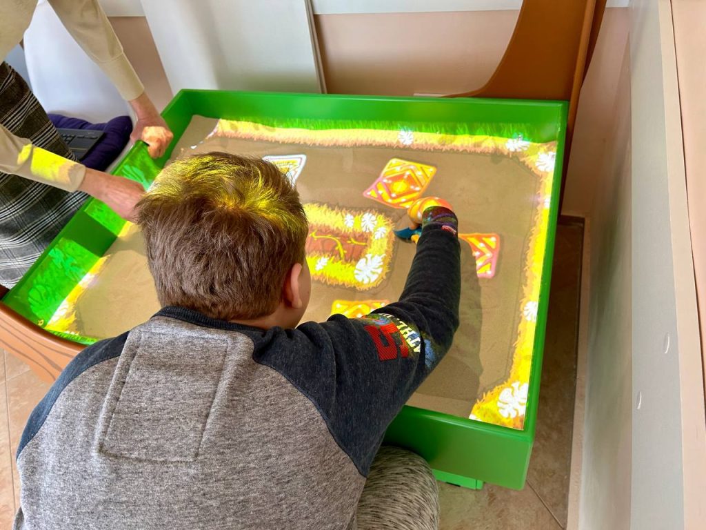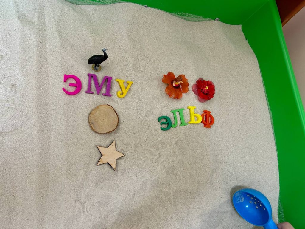 Песочная терапия познакомила ребят с буквой Э и забавной птицей эму, которой то и дело прячет голову в песок. Ребята играли в песочные прятки, выкладывали дорожки для животных и птиц. В интерактивной песочнице развивали внимание и память с помощью игры «Мемо», поочередно открывая изображения птиц и находя пары. Особенность этой игры в песочнице в том, что открывать картинки нужно откапывая песок или насыпая его сверху. Взаимодействие с песком даёт отличный массажный эффект для рук. Ребята также играли в домики, где живут буквы. Открывая двери, можно составлять слова.