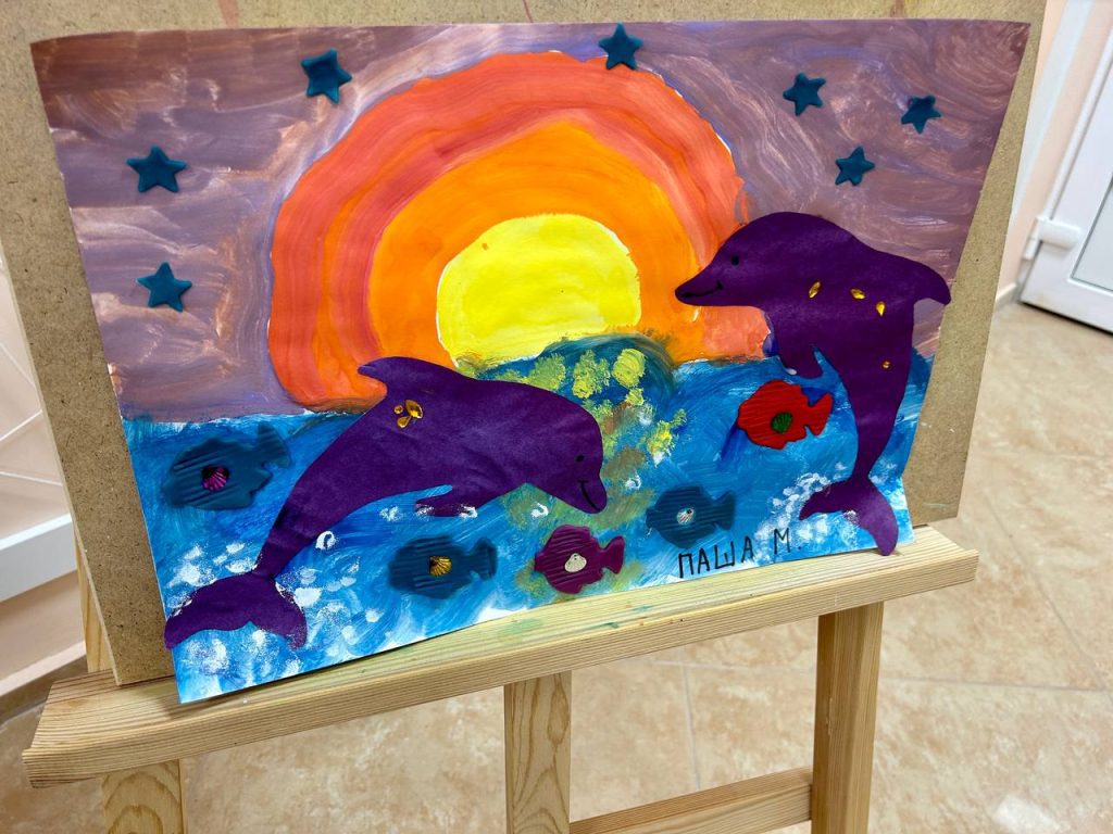 На арт-терапии ребята погрузились в морскую тему, рисовали юные художники дельфинов на закате, которые плещутся в морских волнах. Так, дети закрепляли понятие тёплые цвета (желтый, оранжевый, красный) – ими создавали закат, а с помощью холодной гаммы (синий, фиолетовый, голубой) изображали морские волны. Учились ребята рисовать полукруг, лепили из теста фигурки, а с помощью аппликации – изображали дельфина.