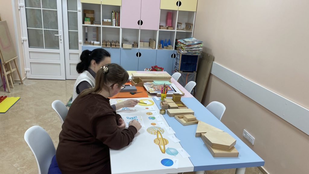 На занятиях по Монтессори-терапии ребята изучали солнечную систему, знакомились с планетами – Меркурий, Венера, Земля, Марс, Юпитер, Сатурн, Уран, Нептун. Изучали отличительные особенности каждой из планет, их расположение относительно Солнца. По возможности писали названия планет на листе бумаги либо определяли первую букву начала названия той или иной планеты. В зоне математических представлений продолжили работать с пособием «золотые бусины» – изучали десятичную систему.