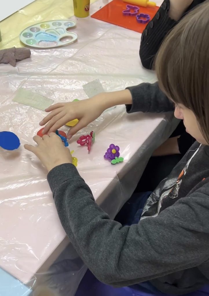 Пятница – день арт-терапии. На этой неделе ребята создавали картину на тему «Подсолнухи». Фон создавали при помощи гуаши. Из тесто-пластилина при помощи пластиковых фигур лепили цветочки, лепестки. Декорировали работу бусинами, блёстками.