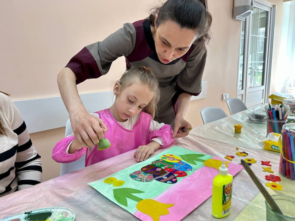Арт-терапия была посвящена пасхальной теме. В основе рисунка фон, созданный кистью и гуашью. В центре композиции пасхальные яйца, которые ребята украшали декоративными липкими лентами, наклейками, бусинами и стразами. Лепили ребята фигурки цветов и бабочек из теста, а маленьких цыплят создавали с помощью оттисков спонжиками. Получились очень яркие пасхальные картинки.