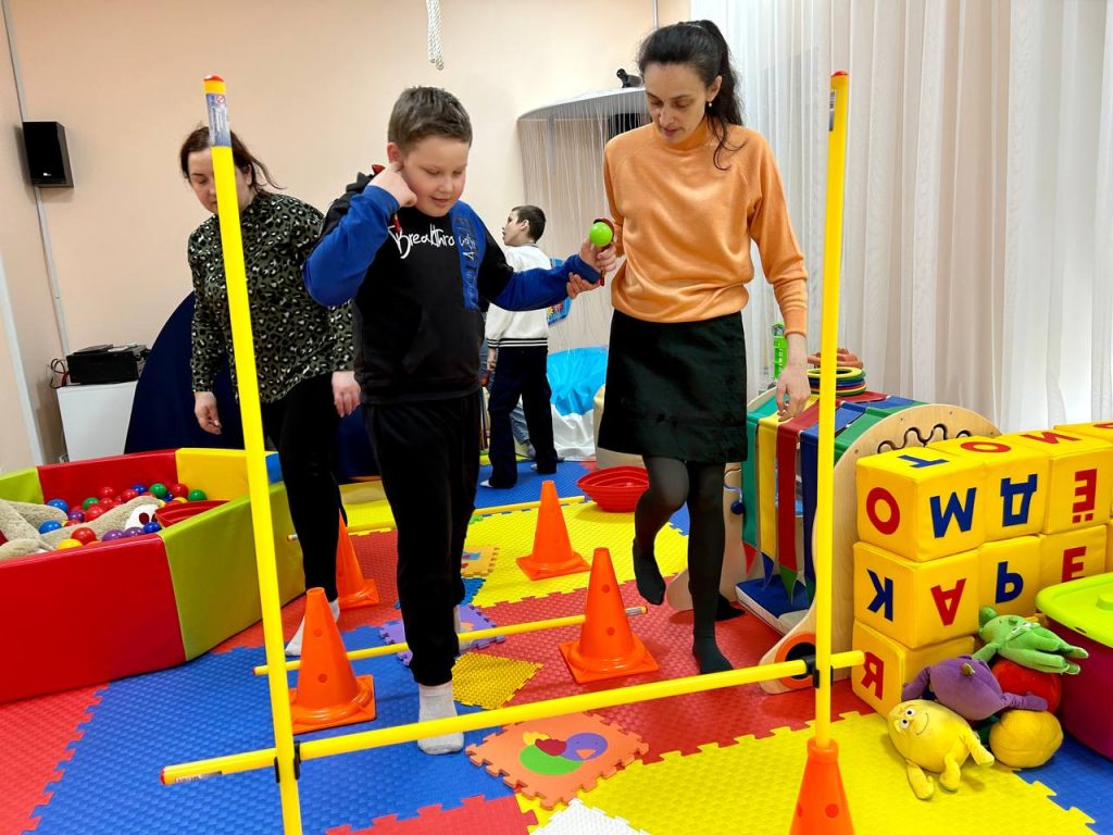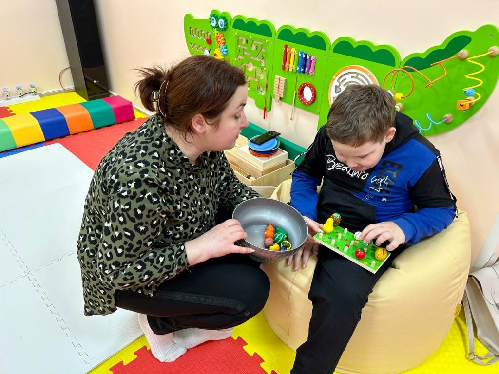 В понедельник сенсорная терапия прошла по мотивам сказки «Репка». Ребятам предлагалось посадить огород, сделать грядки, рассортировать овощи необычным способом – преодолевая полосы препятствий, проходя по дорожкам из массажных ковриков. На финише ребят ожидали импровизированные грядки из разноцветных обручей, куда нужно было посадить определенный овощ. Различные упражнения на двигательную активность ребята делали и на гимнастических мячиках. Активно пользовались дети интерактивным полом, играя в игры на развитие логики, мышления, двигательной активности, пространственной ориентации.