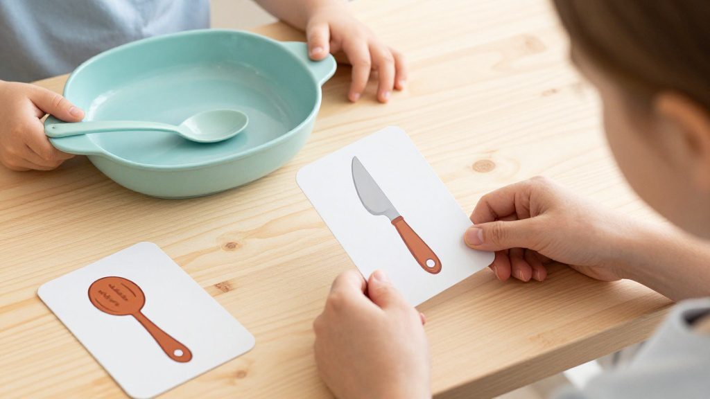 Какие навыки можно отрабатывать на кухне? Здесь ребёнок знакомится с разнообразием глаголов, описывающих действия: отрезать, налить, помешать, сыпать, обмакнуть, черпать, тереть, взбивать, чистить, намазывать, замешивать. Эти слова обогащают его словарный запас, помогая точнее выражать свои мысли и понимать инструкции.