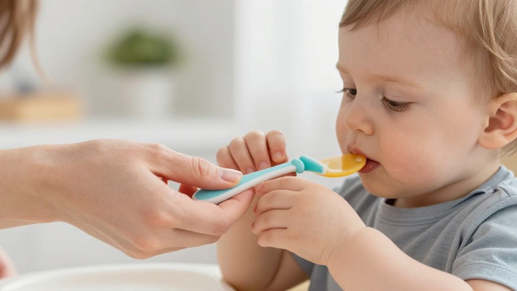 Когда ребёнок начнёт повторять движение сам, ослабьте контроль. Пусть он берёт еду и кладёт её в рот самостоятельно. Не торопите его — у некоторых детей освоение этого навыка занимает от недели до нескольких месяцев. Главное — регулярность и терпение.