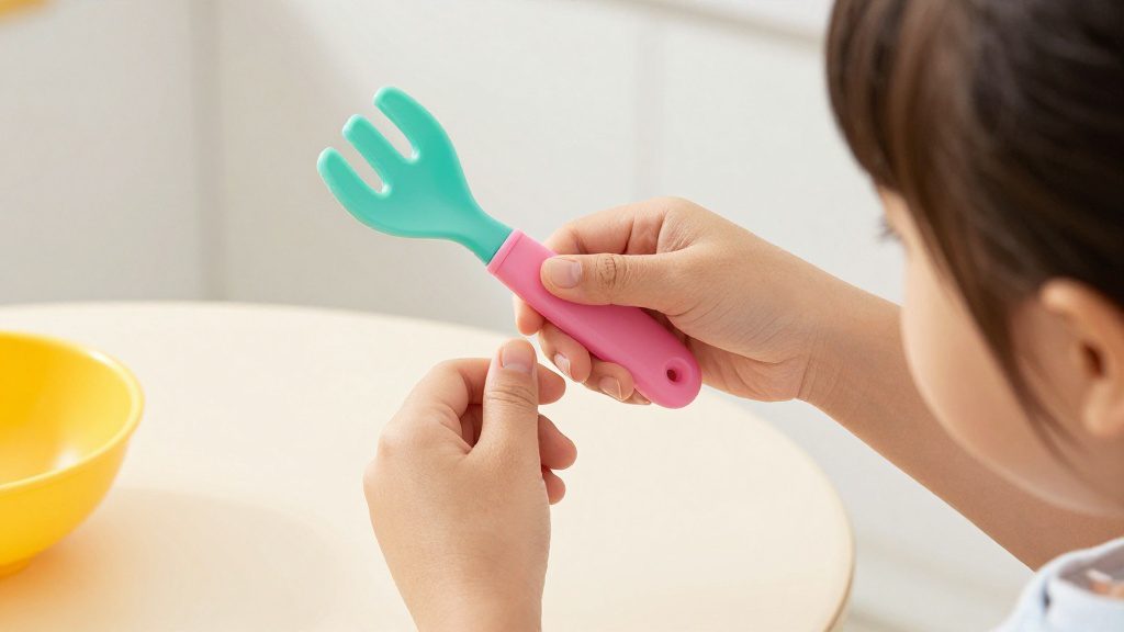 После того как ребёнок освоил ложку, познакомьте его с вилкой. Выбирайте безопасные модели — пластиковые или с закруглёнными краями. Начните с мягкой пищи, которую легко наколоть: мягкий сыр, кусочки хлеба, варёные овощи.