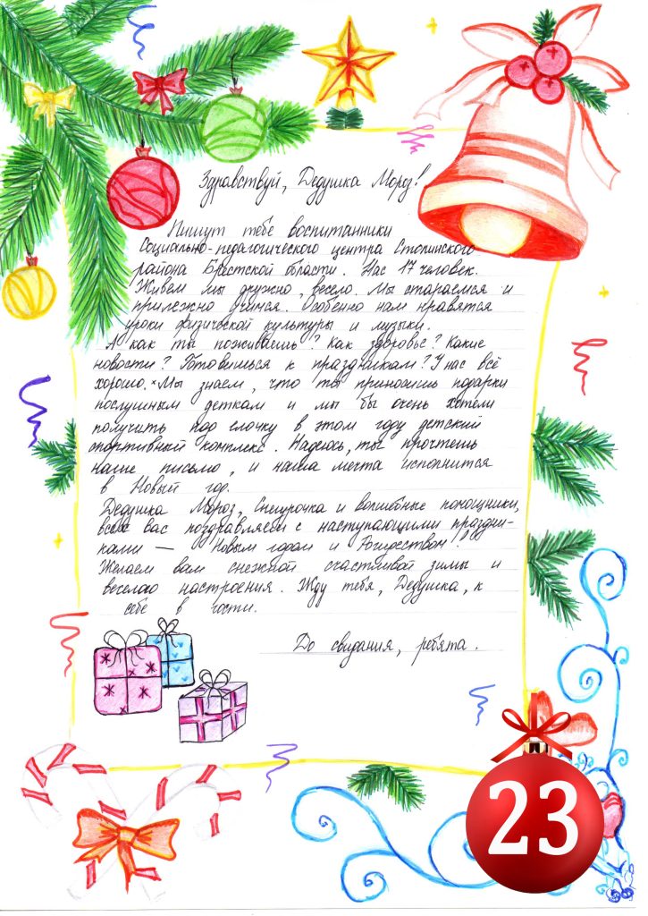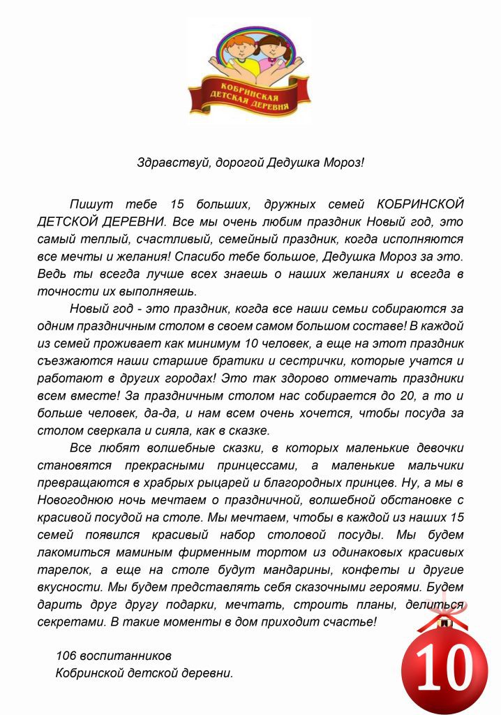 А из Кобрина Деду Морозу «Веры» написали 15 больших и дружных семей Кобринской детской деревни (шар №10). В 15 домах этой деревни проживают 106 воспитанников. Это дети-сироты и дети, оставшиеся без попечения родителей. Новогоднюю ночь в этих семьях мечтают отметить в красивой обстановке, за праздничным столом. Учреждение просит подарить набор столовой посуды в каждый дом. На такой подарок необходимо собрать ещё 2321 рубль.