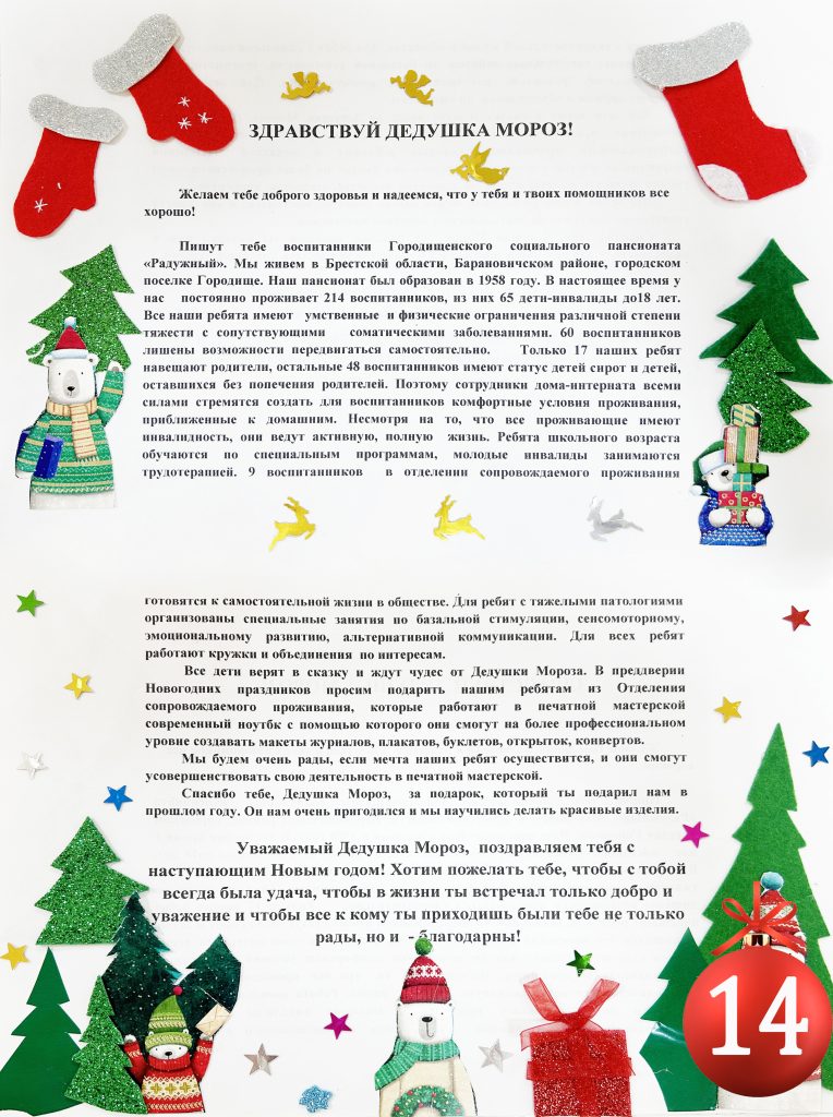 В Городищенском детском социальном пансионате «Радужный» (шар №14) постоянно проживает 214 воспитанников, 65 из них – дети-инвалиды. Большое внимание в пансионате уделяется социализации особенных деток, обучению их навыкам через творчество и трудотерапию. Здесь работает множество кружков и объединений по интересам. Деда Мороза просят о важном подарке – современном ноутбуке в печатную мастерскую, чтобы ребята смогли совершенствовать своё мастерство в создании буклетов, открыток, плакатов и журналов. На подарок необходимо собрать 2965 рубль, на подарок собран только 1% от необходимой суммы.
