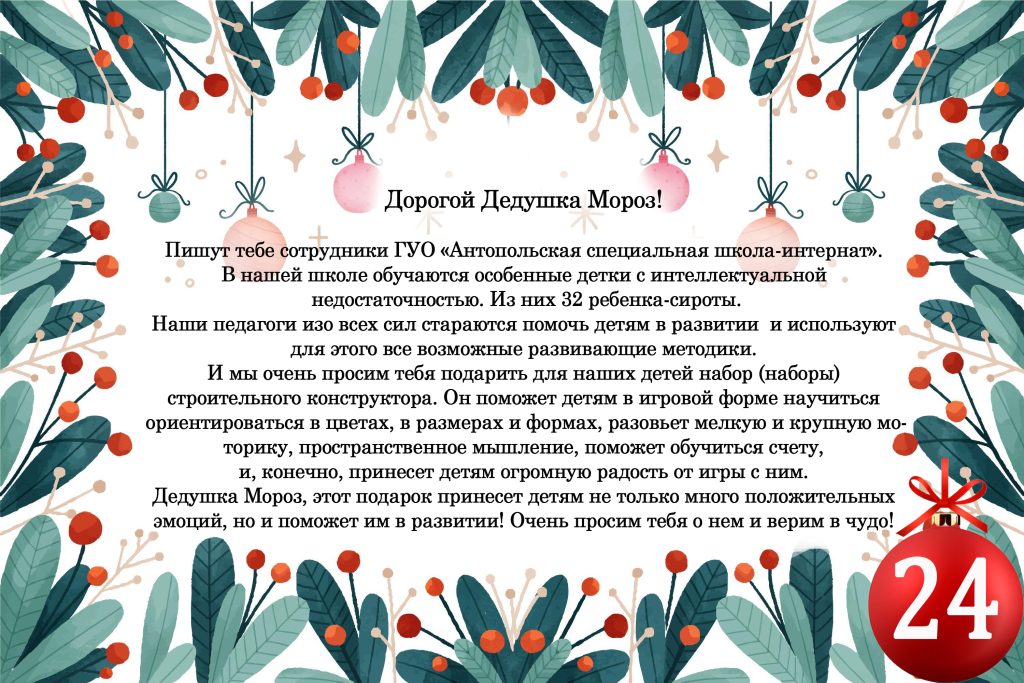 В Антопольской специальной школе-интернат (шар №24) обучаются 94 ребёнка с интеллектуальной недостаточностью, из них 32 ребенка-сироты. Для ребят был бы очень актуален подарок в виде наборов строительного конструктора для развивающих и обучающих занятий с детьми. На подарки по ёлку для воспитанников этой школы-интерната собрать нужно ещё 1745 рублей.