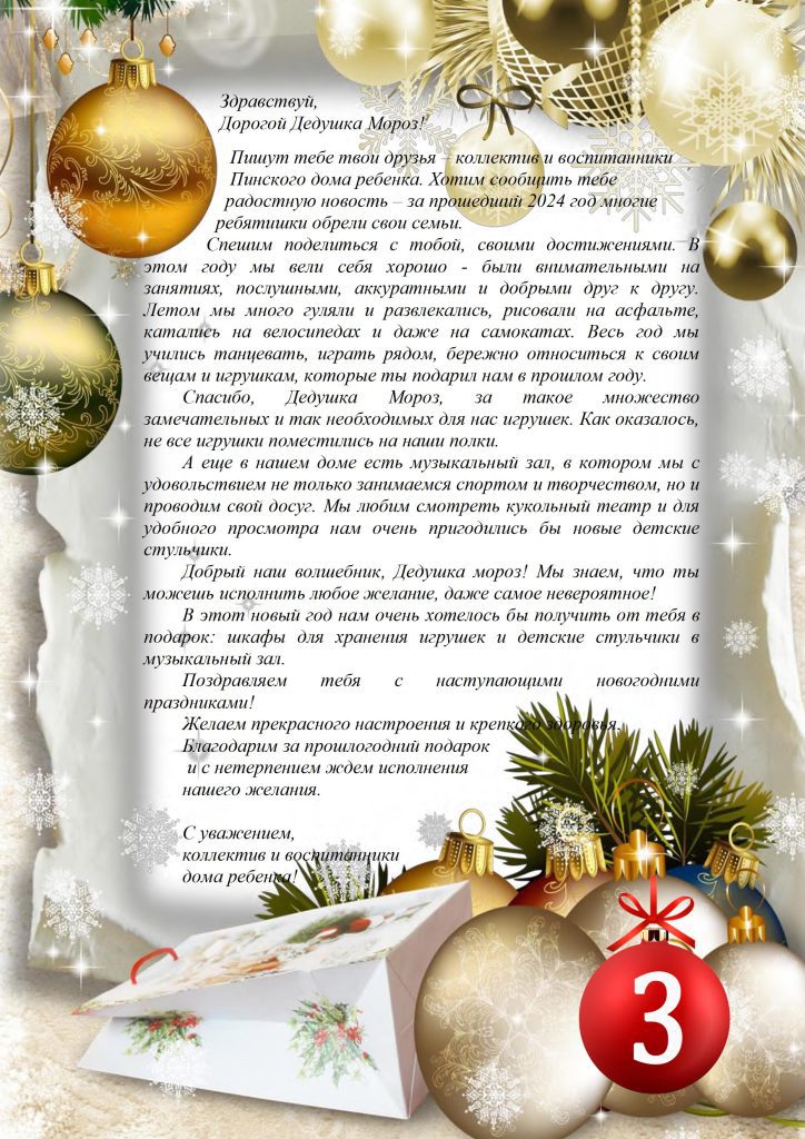 Поступило Деду Морозу письмо от коллектива и маленьких воспитанников Пинского специализированного дома ребёнка (шар №3). В письме рассказывают о тех малышах, которые в этом году обрели настоящее счастье – нашли новую семью. В доме малютки остаются жить 42 малыша в возрасте от 0 до 4-х лет. Деда Мороза просят о полезном подарке – шкафы для хранения игрушек и стульчиках в музыкальный зал. На подарок для малышей необходимо собрать 2703 рубля, собрано только 10% от необходимой суммы.