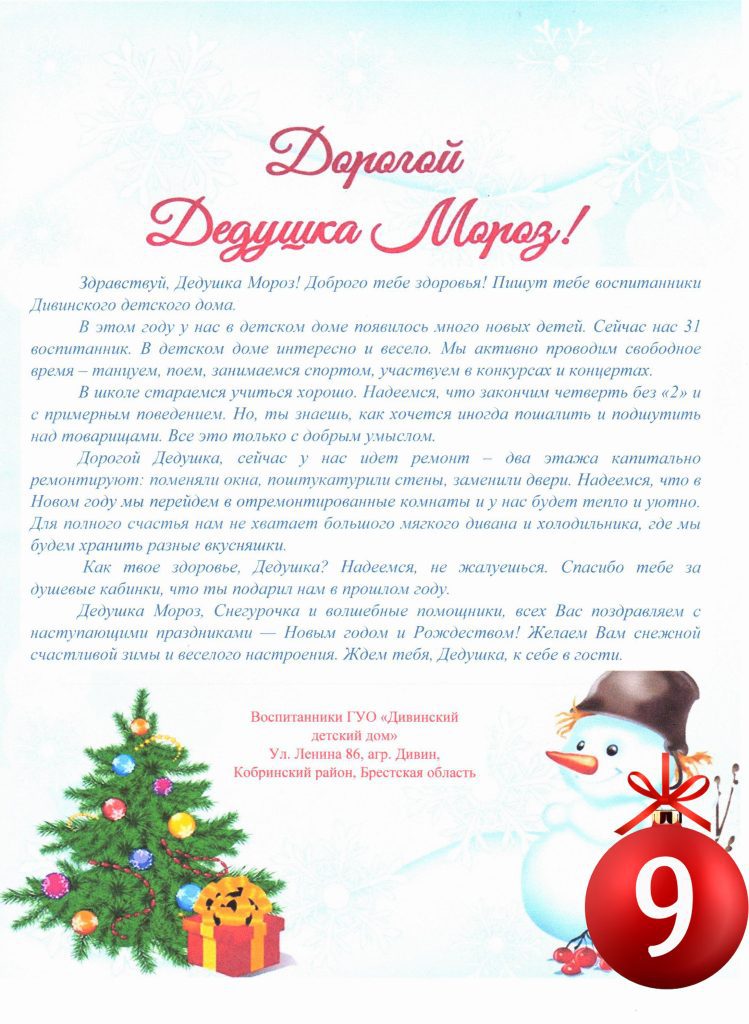 Письмо от Дивинского детского дома (шар №9) повествует, что в этом году в доме появилось много новых детей. Сейчас здесь проживает 31 воспитанник. Деду Морозу рассказывают о больших перестройках в детском доме, сейчас здесь идёт ремонт на двух этажах. Ребята ждут, когда смогут переселиться в отремонтированные комнаты и для полного ощущения домашнего уюта им не хватает мягкого дивана и холодильника для хранения вкусняшек. На такой подарок необходимо собрать ещё 2890 рублей, собран 4% от необходимой суммы.