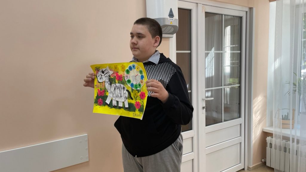 На занятиях по арт-терапии в пятницу ребята создавали картину «Зебра и время». Рисовали фон при помощи кисточек и валиков, затем вырезали зебру – а разукрашивали её необычным способом при помощи пластиковой вилки. Приклеивали зебру к фону, дорисовывали недостающие элементы. Готовую работу украшали фигурками из теста-пластилина, бисером.