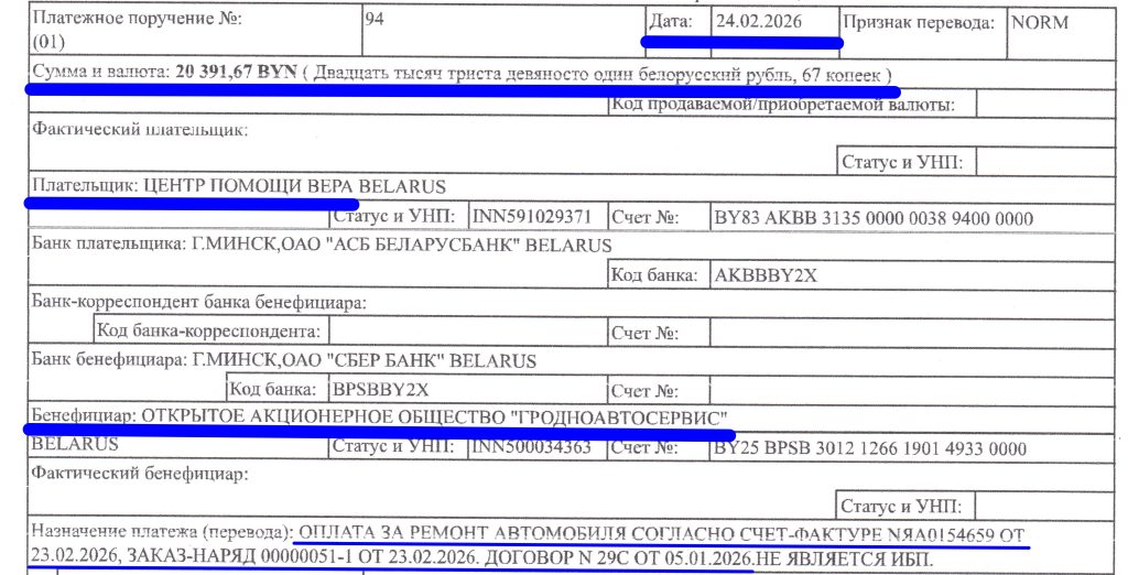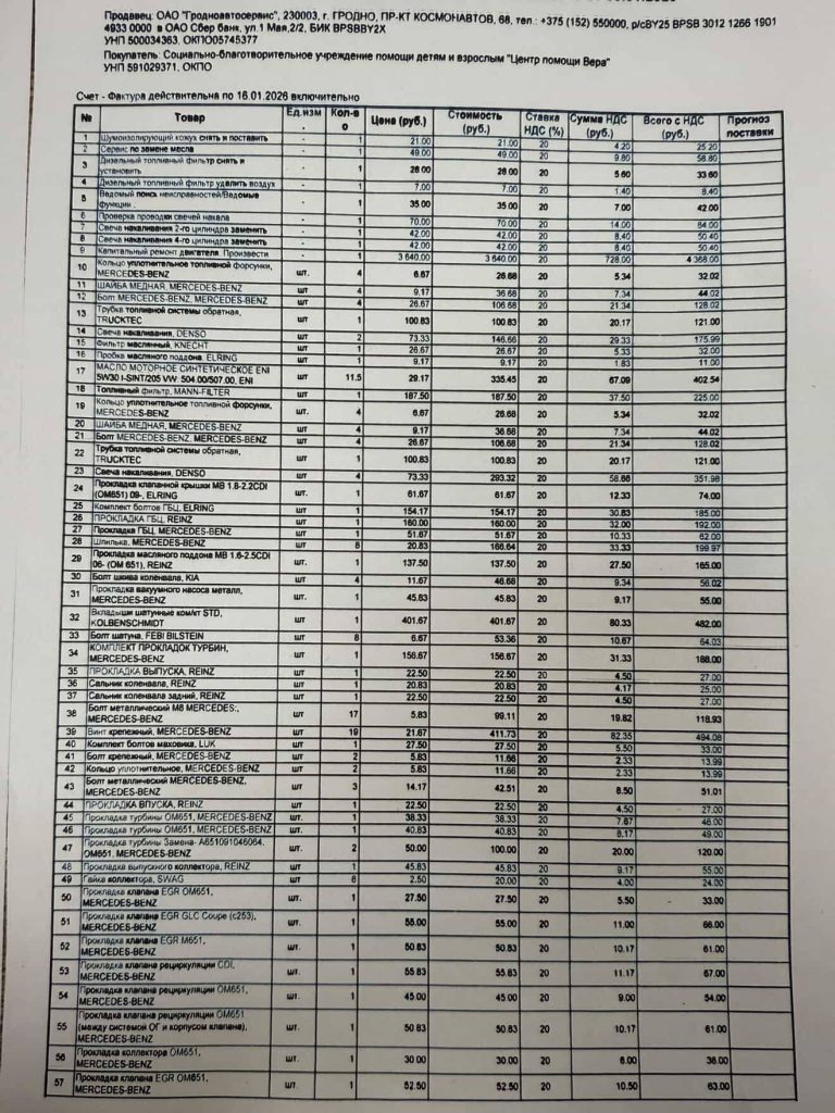 В январе 2026 года наш единственный автомобиль — Mercedes Sprinter 2021 года выпуска — встал на капитальный ремонт двигателя. Машина, которая пять лет возила гуманитарную помощь в детские дома, интернаты для престарелых и инвалидов, приюты для бездомных по всей Беларуси, оказалась обездвижена.