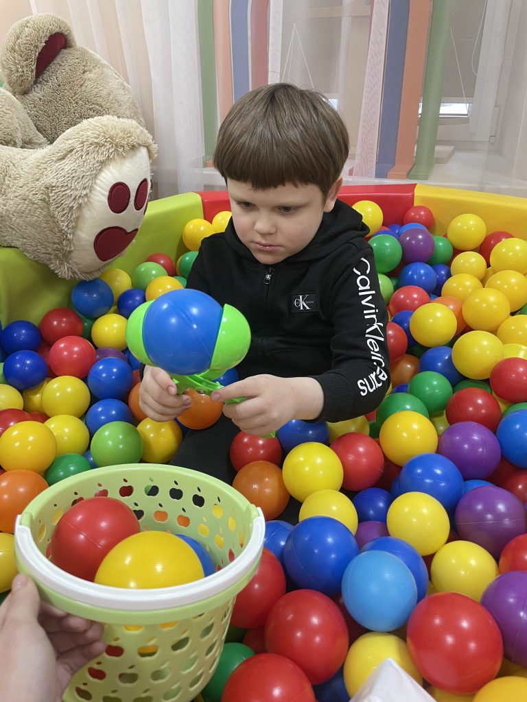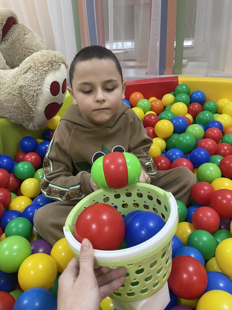 Сухой бассейн с шариками — одно из любимых мест детей. Погружение в шарики дает глубокое тактильное давление, которое успокаивает нервную систему. Мы усложняли задачу: искали в шариках предметы определенного цвета, доставали их и сортировали. Так игра становилась еще и обучающим процессом.