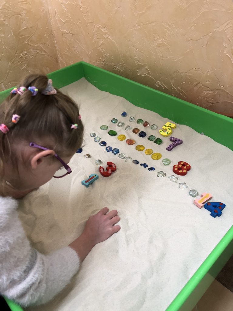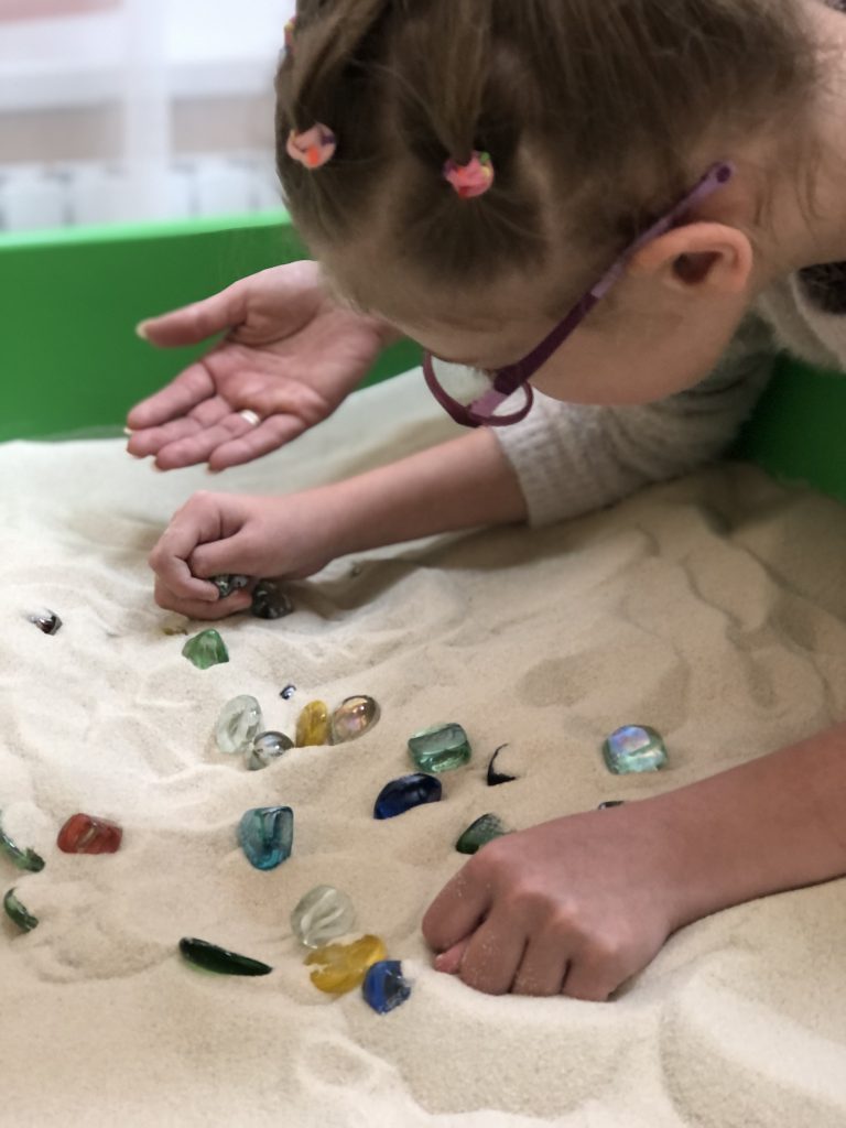 Песочница светилась разными цветами, и дети подбирали к каждому цветному полю соответствующие фигурки — красные яблоки к красному полю, синие шары к синему. Потом мы усложняли задачу — просили не просто найти предмет, но и назвать его, придумать ассоциацию.