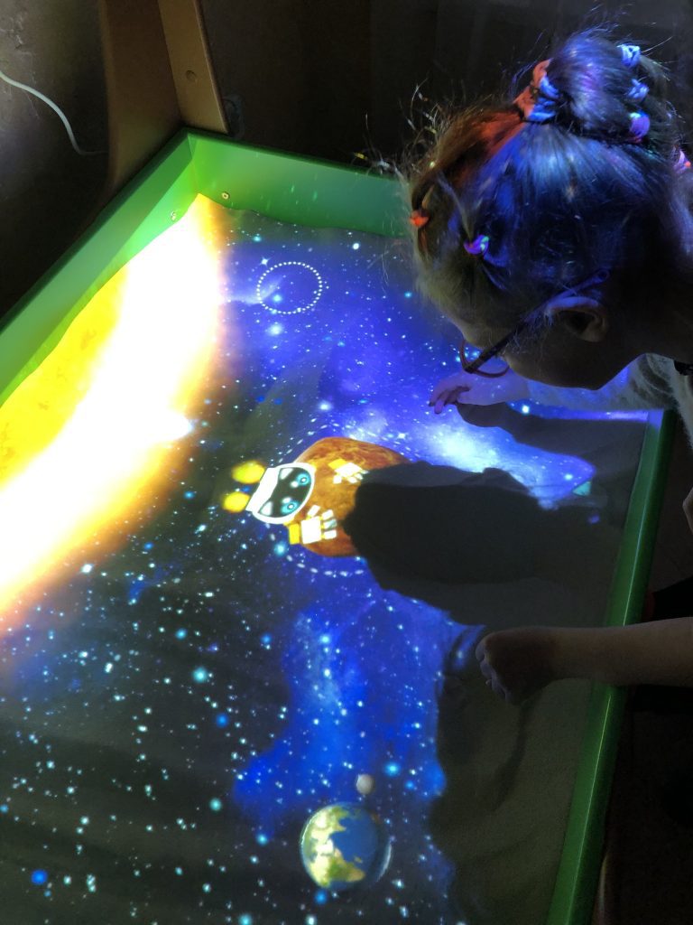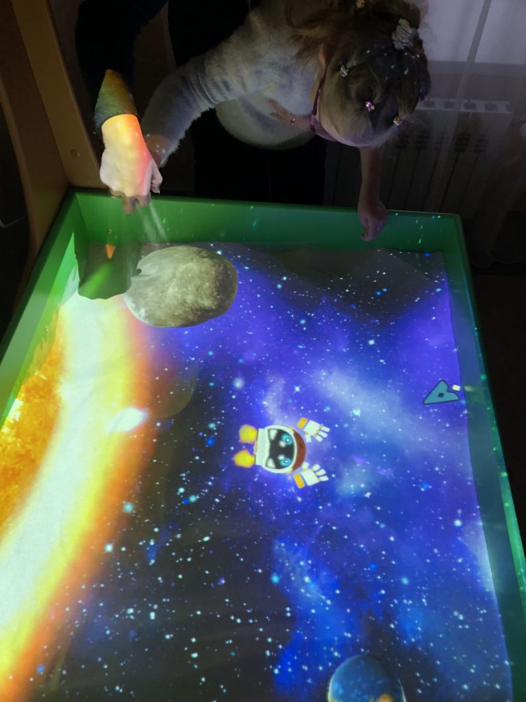 Потом песочница становилась космическим пространством. Под ногами у детей оказывались поверхности далеких планет — красный Марс, синий Нептун. Они строили кратеры и горные цепи, а над ними проецировалось звездное небо с летающими кораблями. В этот момент обычное занятие превращалось в межпланетную экспедицию.