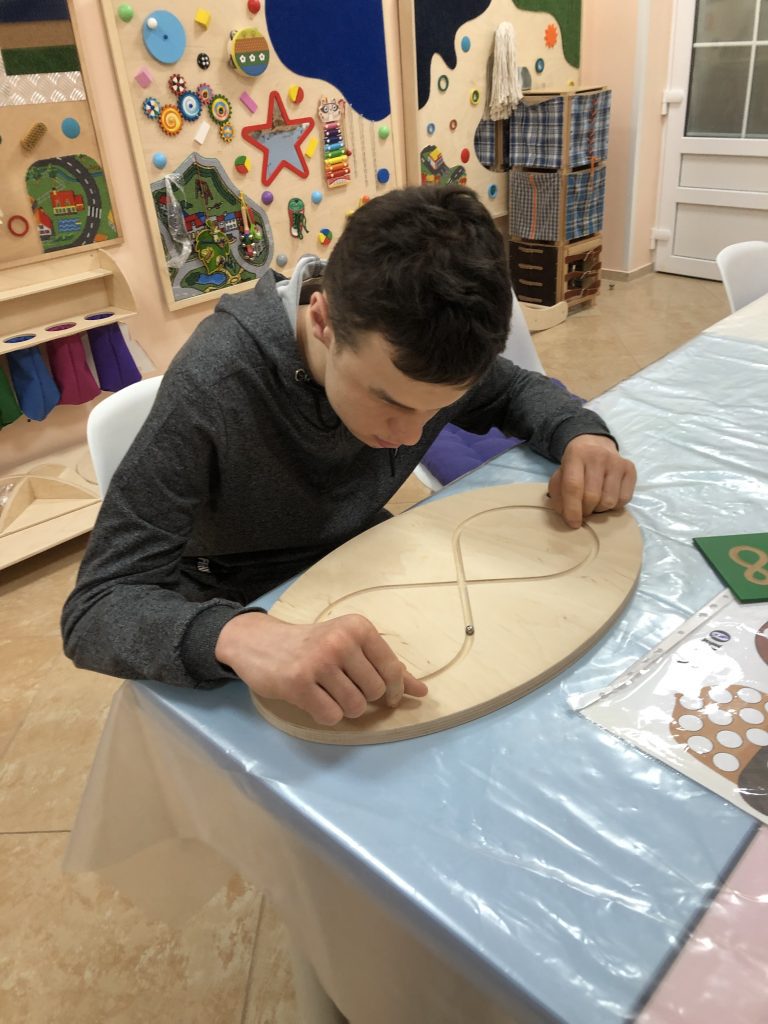 Мы наблюдали, как дети осваивают практические навыки. Кто-то впервые застегнул пуговицу на специальной рамке — и его лицо озарила улыбка победы. Кто-то научился пересыпать крупу из кувшина в кувшин, почти не просыпая — это будущий навык самостоятельного приема пищи. Рамки со шнуровками, липучками, молниями — кажется, простые игрушки, но для многих наших детей каждая такая застежка — серьезное достижение.