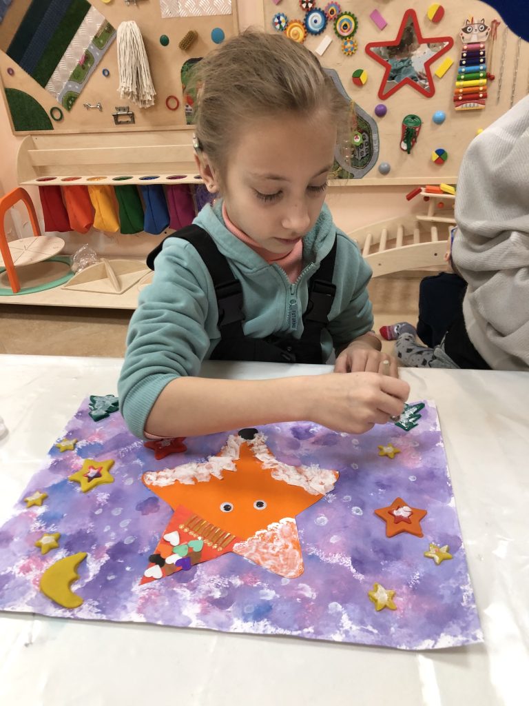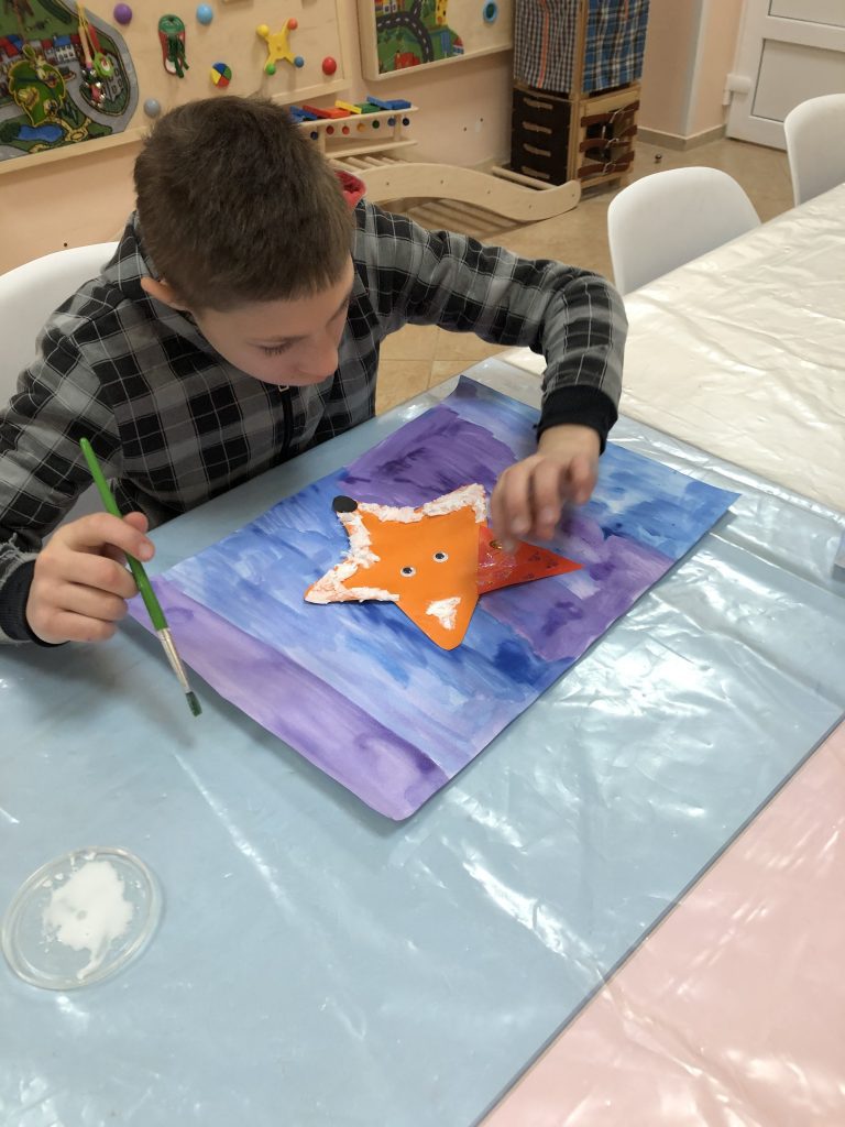 Особое внимание мы уделяли развитию мелкой моторики. Дети учились работать ножницами, аккуратно нарезая полоски бумаги для «шарфика» таксе. Они приклеивали мелкие детали, развивая точность движений. Но арт-терапия — это не только про навыки. Это про выражение эмоций. Некоторым детям в начале занятия нужно было снять напряжение — и мы предлагали просто порвать бумагу на мелкие кусочки. Эта простая техника помогала им успокоиться и настроиться на творчество.